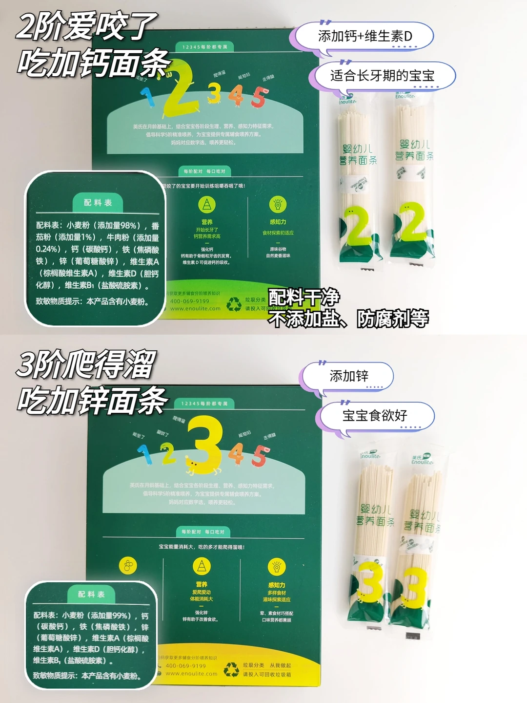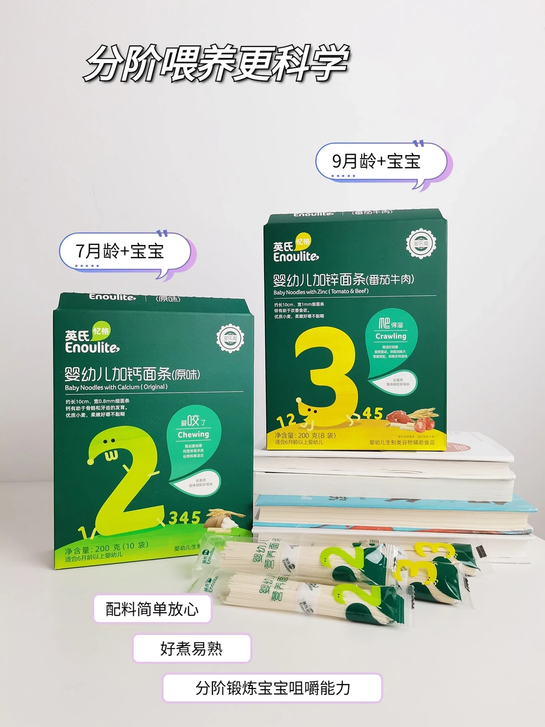 我家👶最开始添加辅食面的时候吃的是英氏2阶加钙面条,是10cm长0.8mm宽的小线面,专为7月龄以上宝宝研发的,能够锻炼宝宝咀嚼和舌头搅拌能力,还特别强化了钙和维生素D,照顾到长牙阶段的宝宝👏。