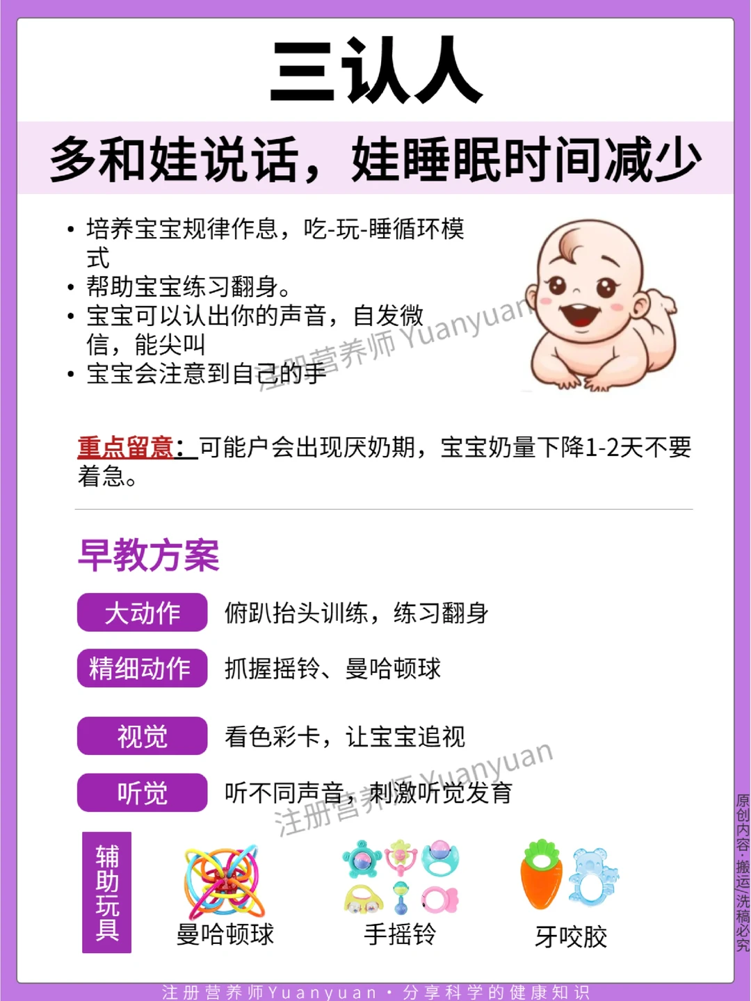 ✅宝宝3月份睡眠会逐渐减少,爸妈尽量不要为了让宝宝睡觉,就开始抱睡,这样之后宝宝可能会出现依赖。另外,3月龄的宝宝可能会出现厌奶期,这个时候宝宝出现奶量下降1-3天不要着急,但如果连续1周奶量偏低,要即时就医。