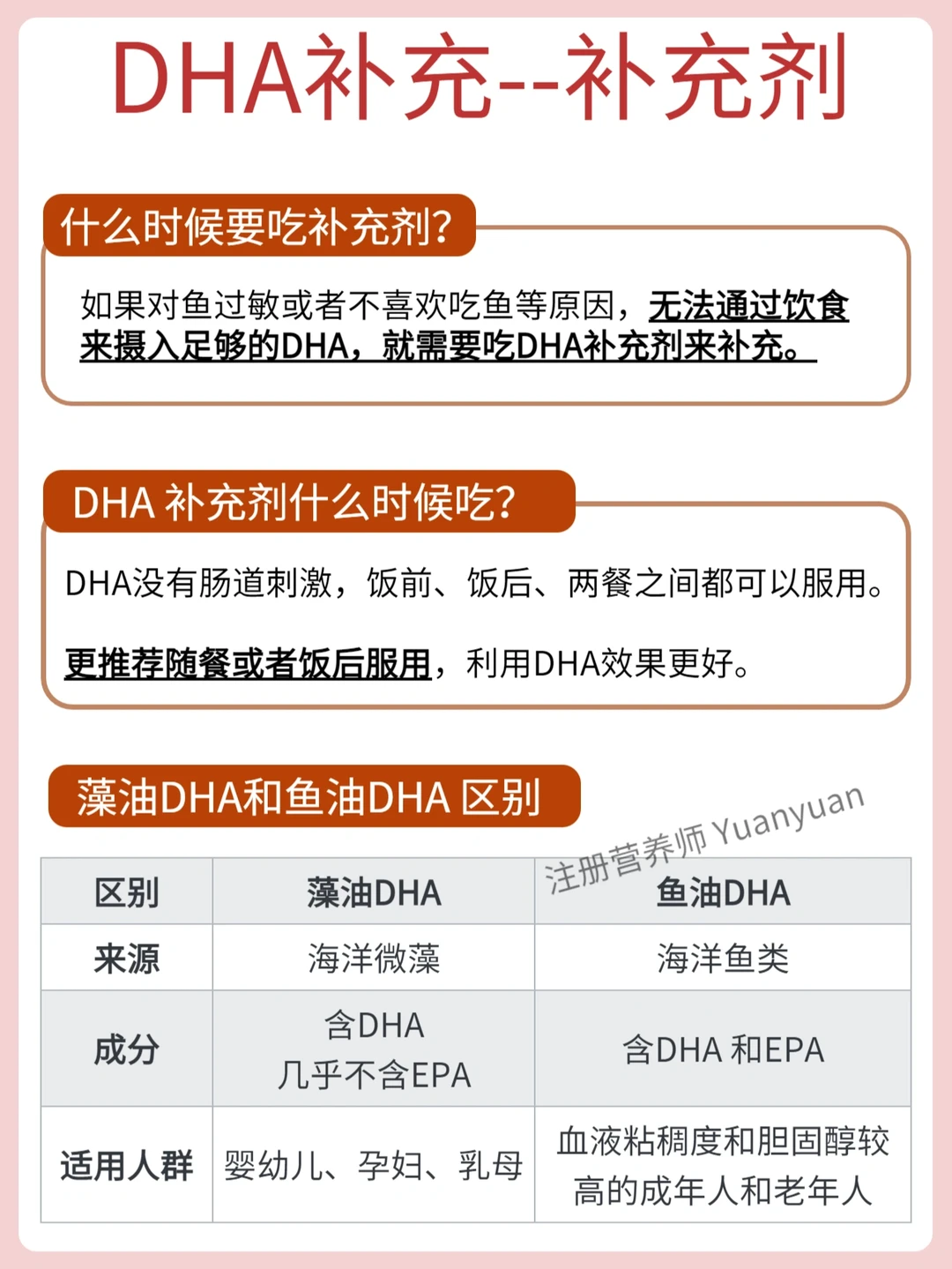 ⭐️强调:如果无法通过上方饮食摄入足够的DHA,需要吃DHA补充剂。