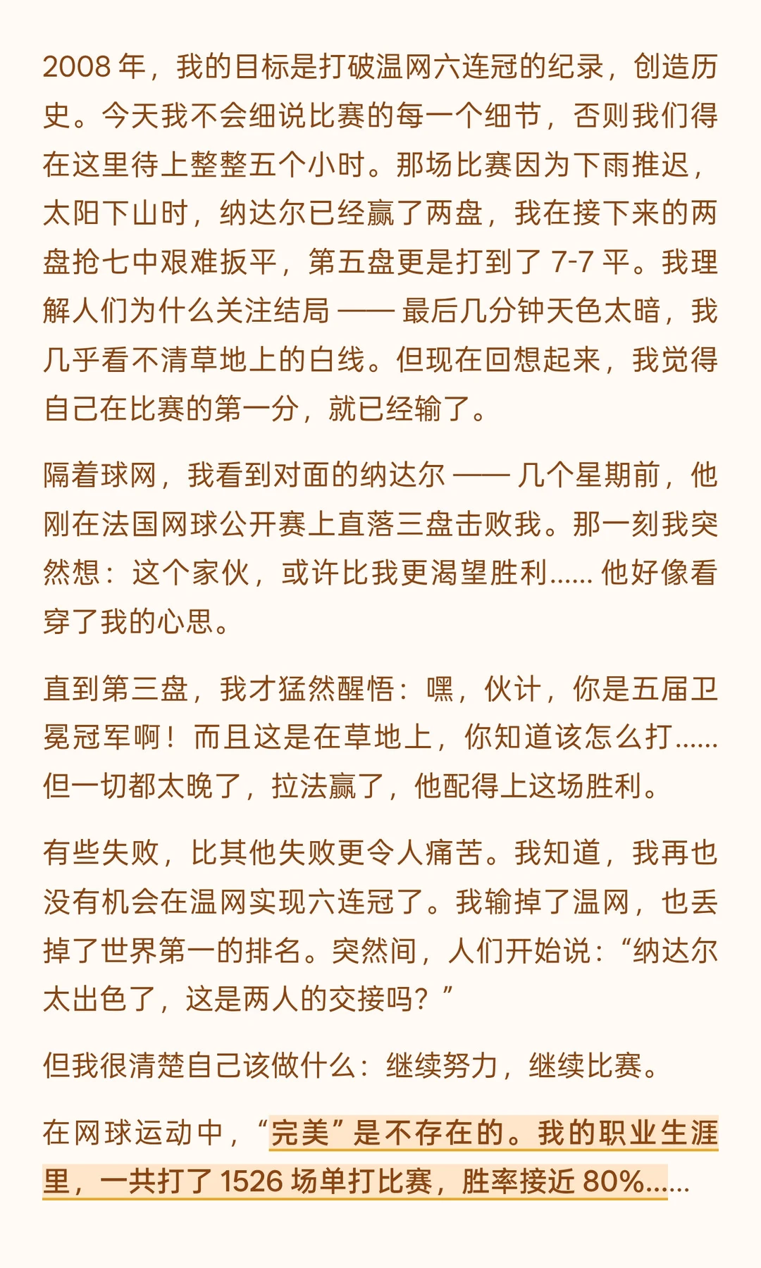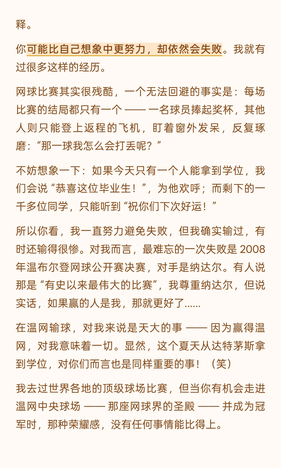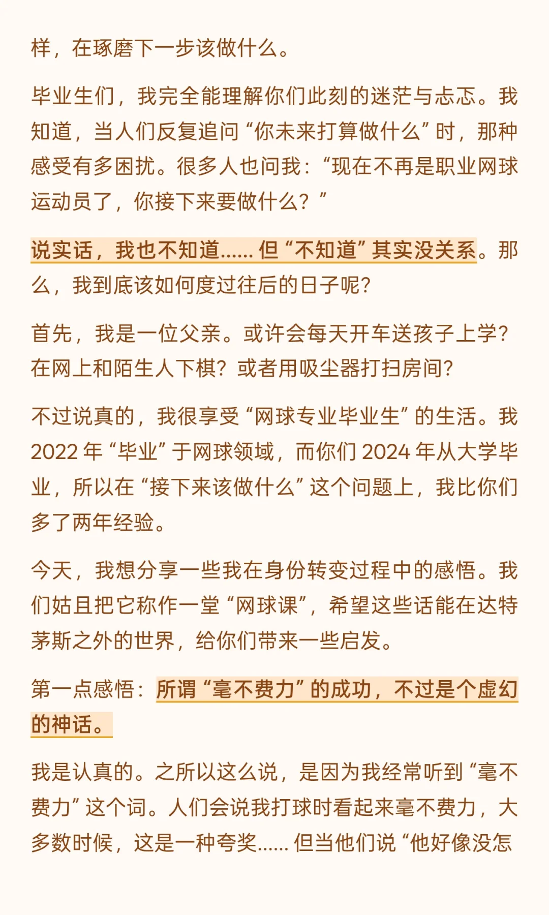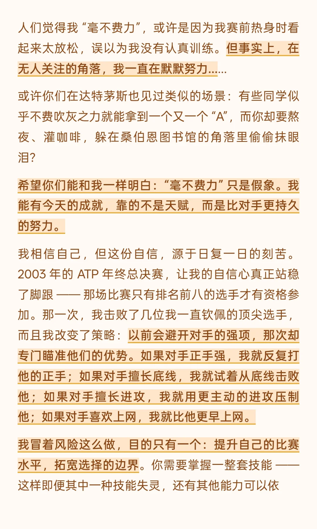 他没有居高临下的说教,而是以 “两次毕业者” 的身份 ——16 岁 “毕业” 于校园、投身职业网坛,41 岁 “毕业” 于网坛、开启人生新程 —— 将赛场经历与人生感悟娓娓道来:从拆解 “毫不费力” 的成功神话,借由意大利公开赛的警钟与 ATP 总决赛的策略转变,印证 “持久努力方为底气”;到以 2008 年温网决赛的遗憾、“仅 54% 得分率” 的真相,教会人 “正视失败、专注下一刻”;
