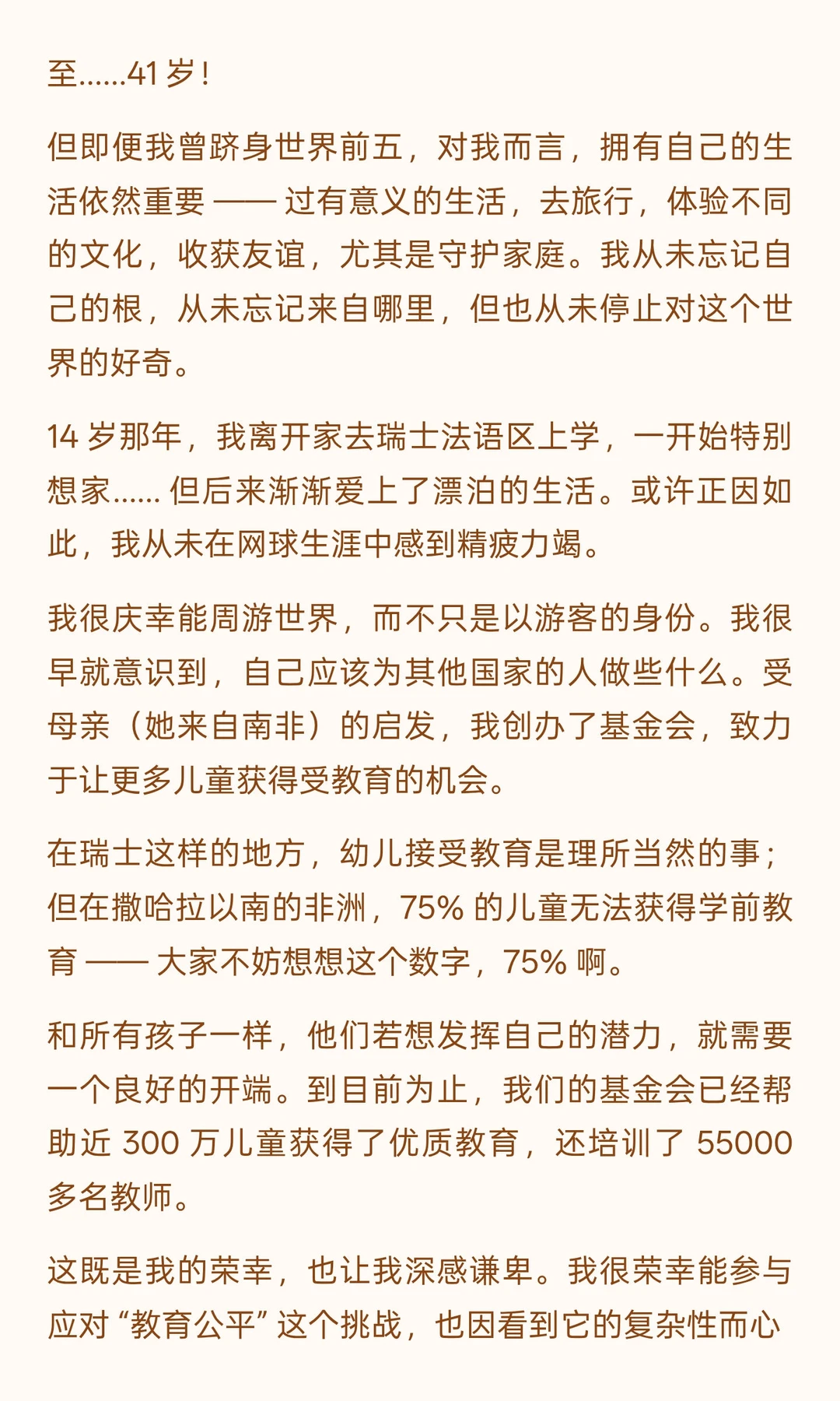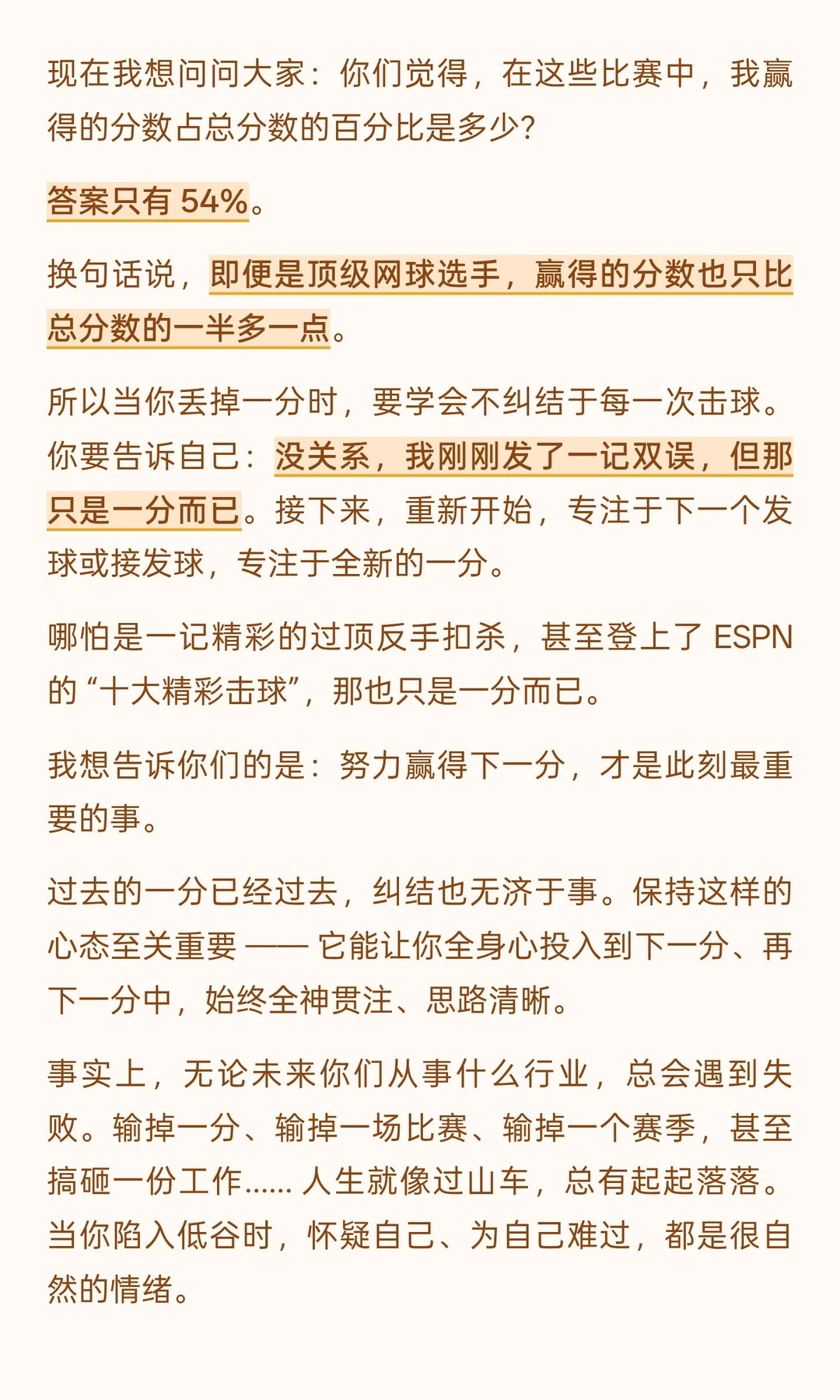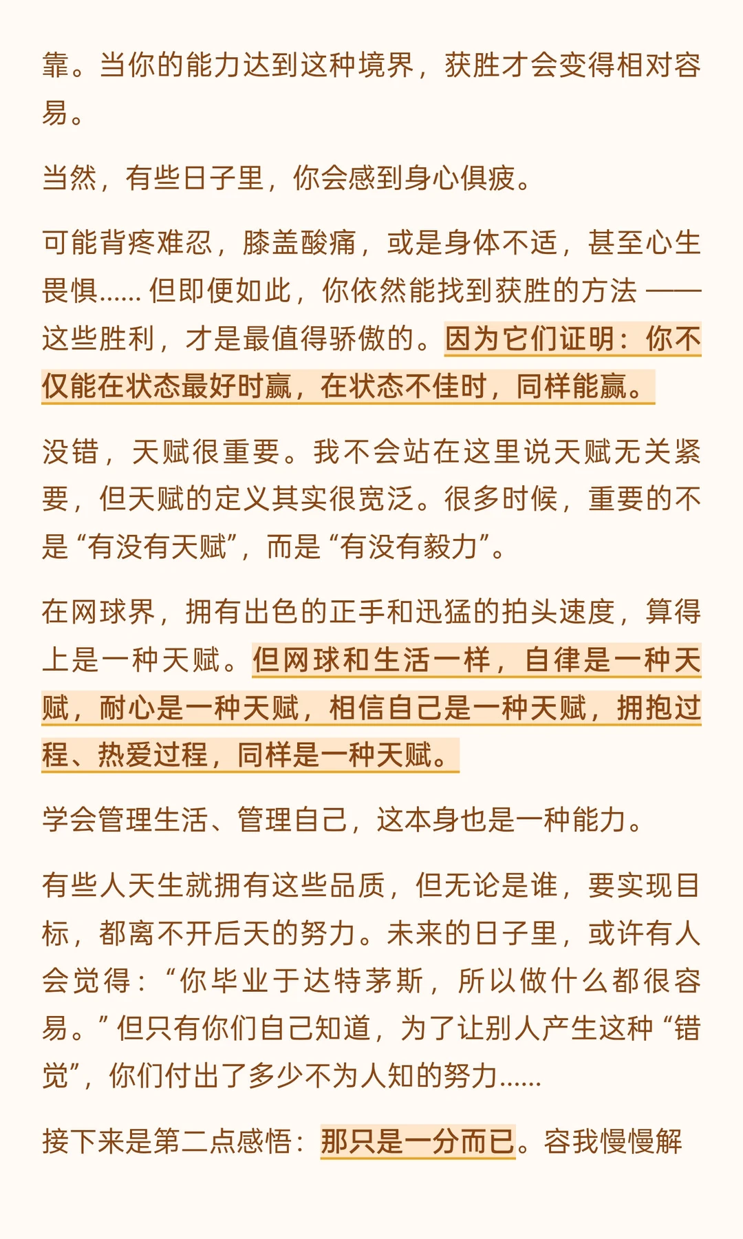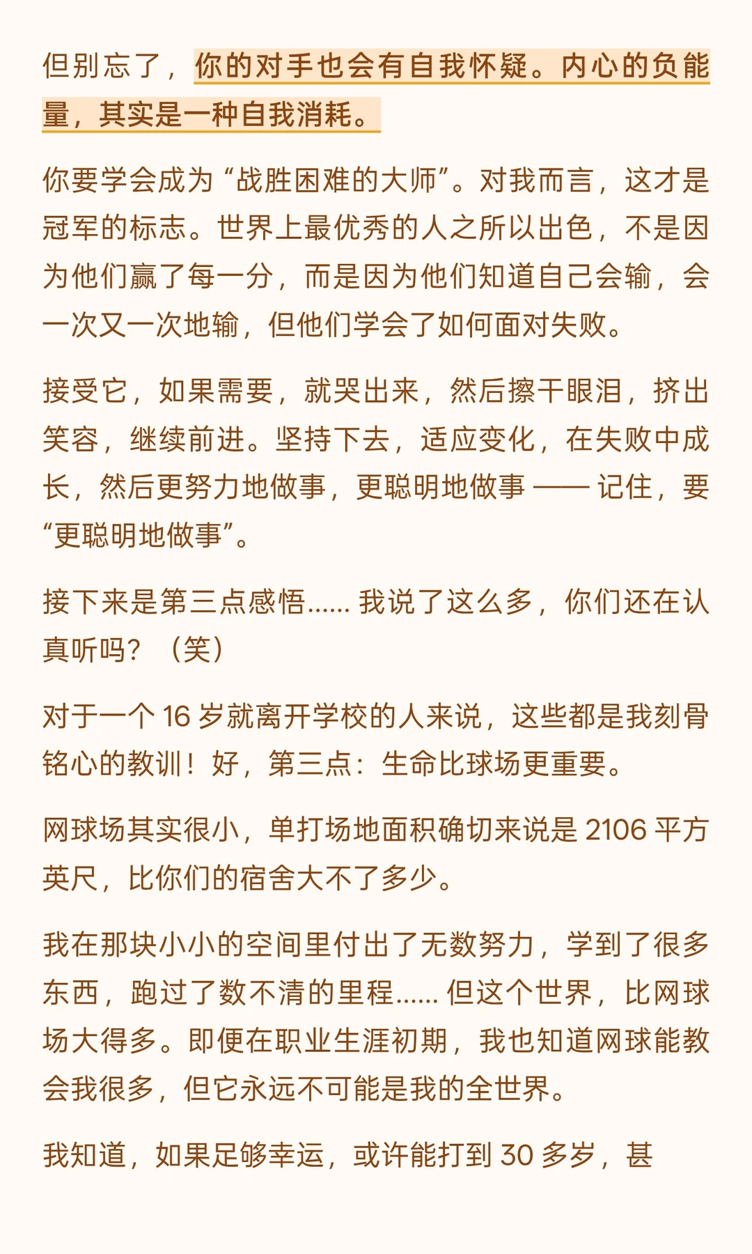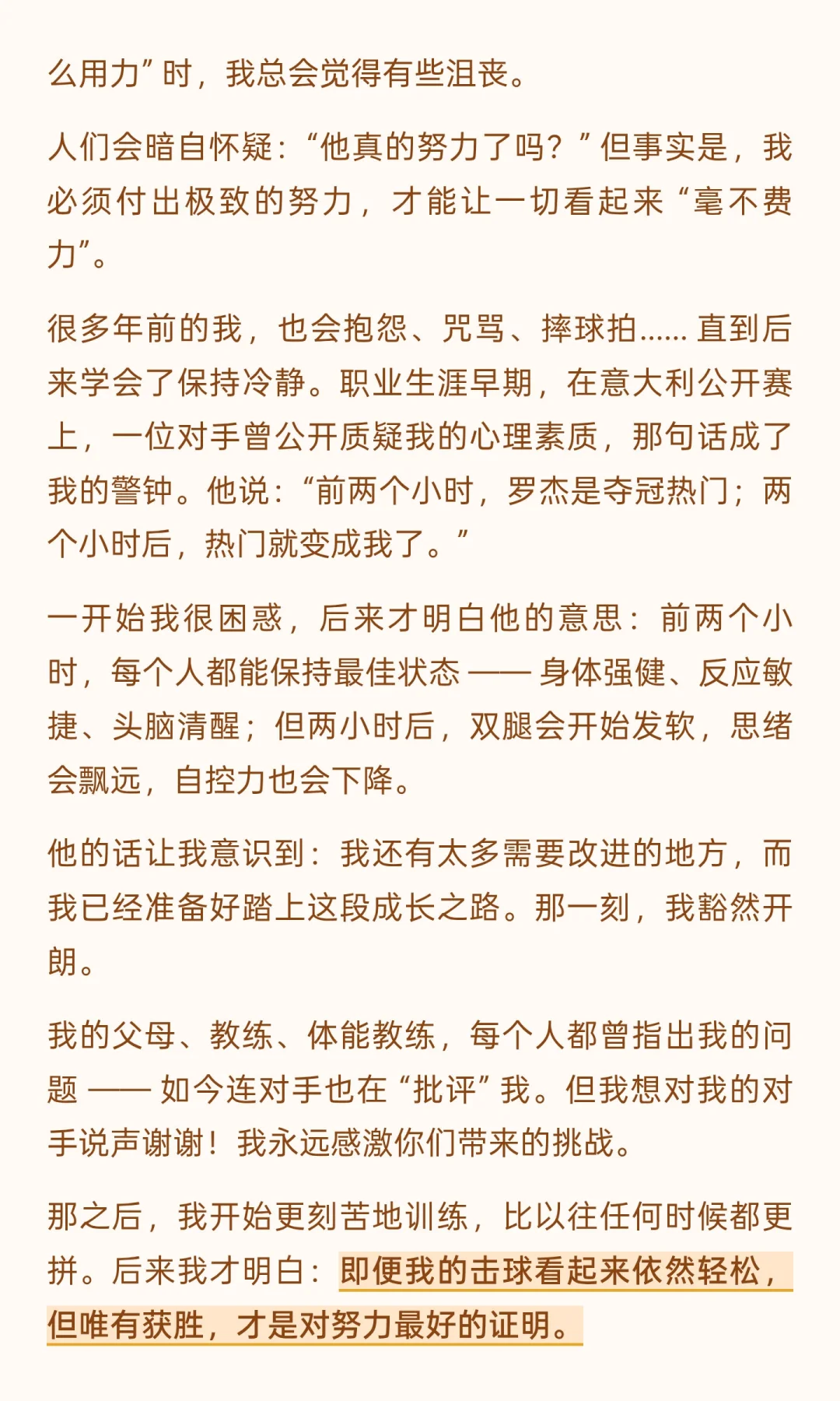 他没有居高临下的说教,而是以 “两次毕业者” 的身份 ——16 岁 “毕业” 于校园、投身职业网坛,41 岁 “毕业” 于网坛、开启人生新程 —— 将赛场经历与人生感悟娓娓道来:从拆解 “毫不费力” 的成功神话,借由意大利公开赛的警钟与 ATP 总决赛的策略转变,印证 “持久努力方为底气”;到以 2008 年温网决赛的遗憾、“仅 54% 得分率” 的真相,教会人 “正视失败、专注下一刻”;