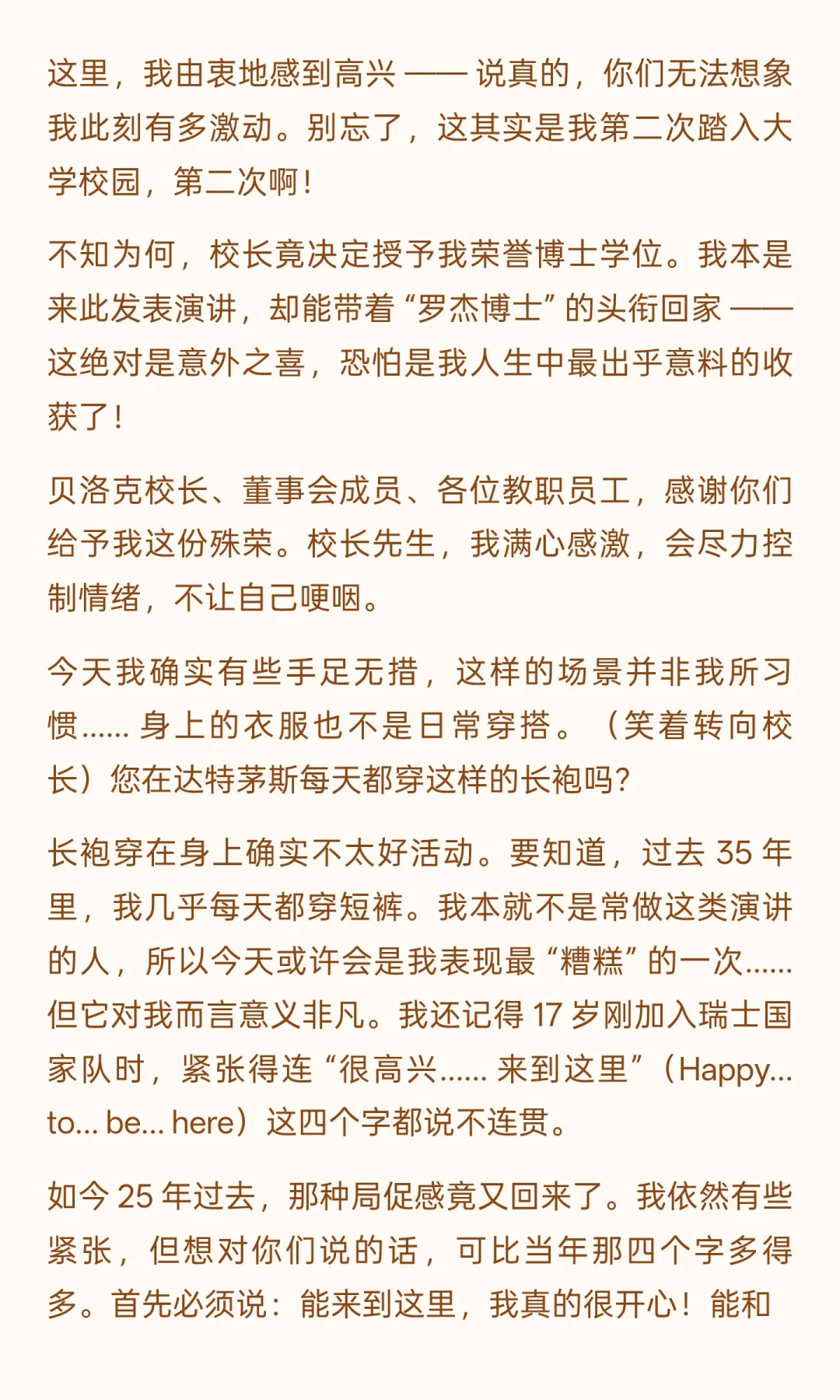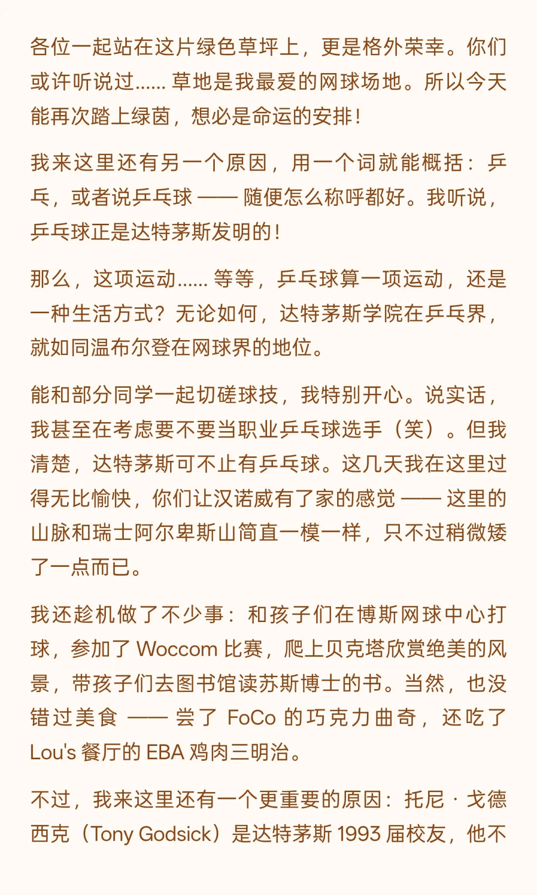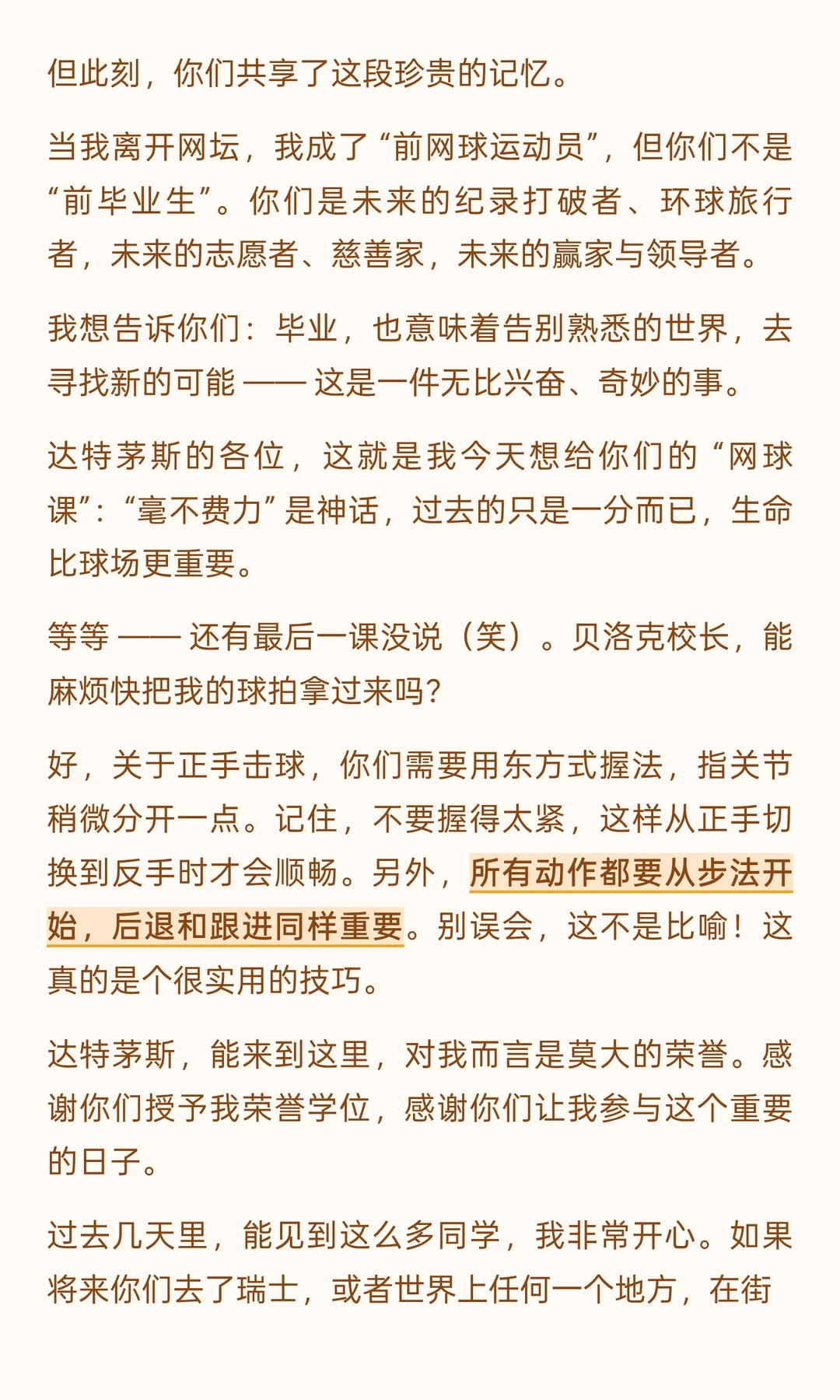 调侃长袍不如短裤自在的幽默、提及达特茅斯乒乓球渊源的亲切、回忆带孩子读苏斯博士的温情,甚至结尾猝不及防的 “正手击球教学”,都让严谨的人生感悟多了份烟火气。