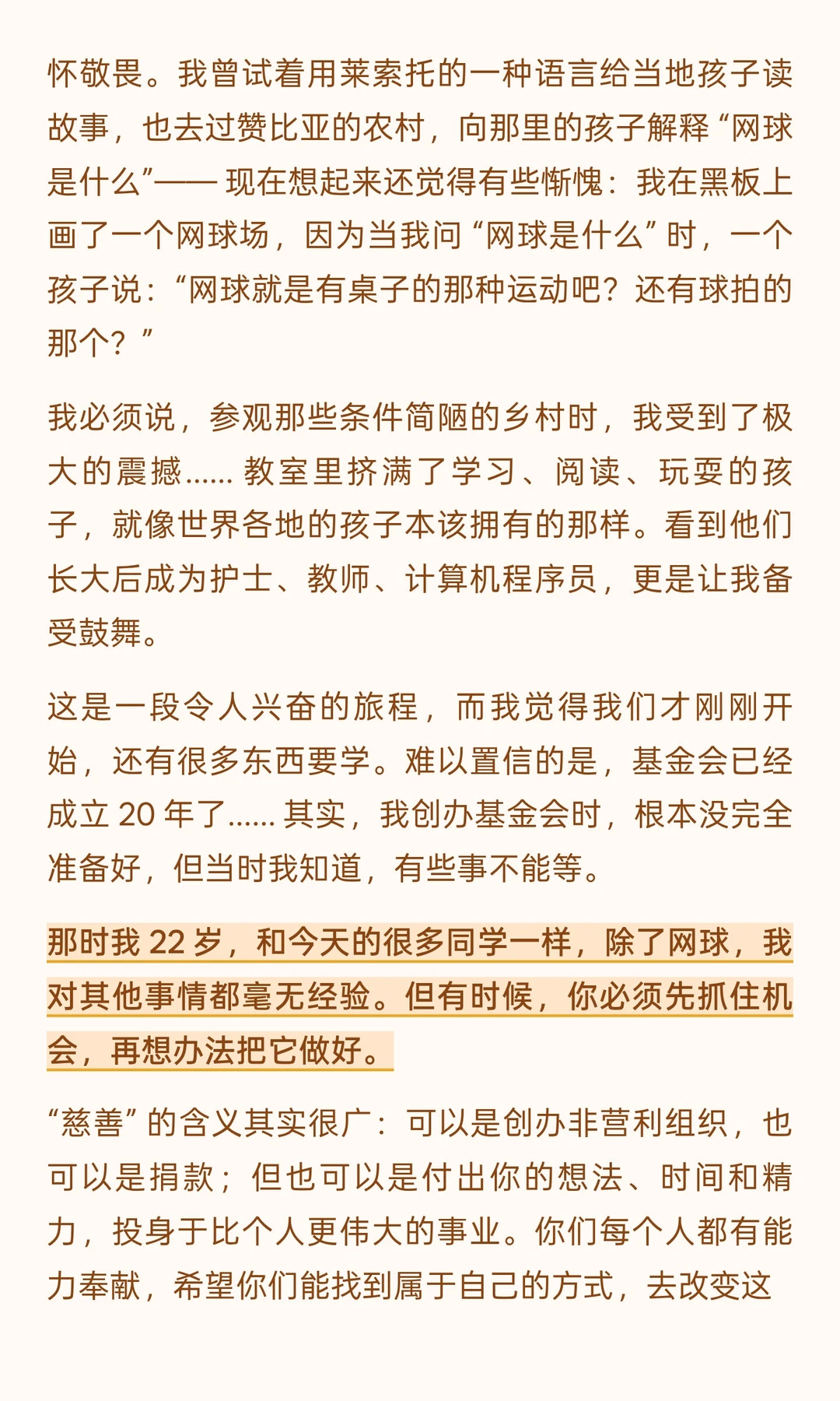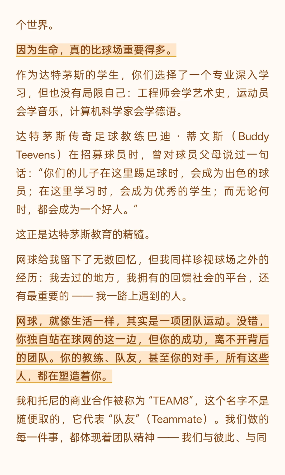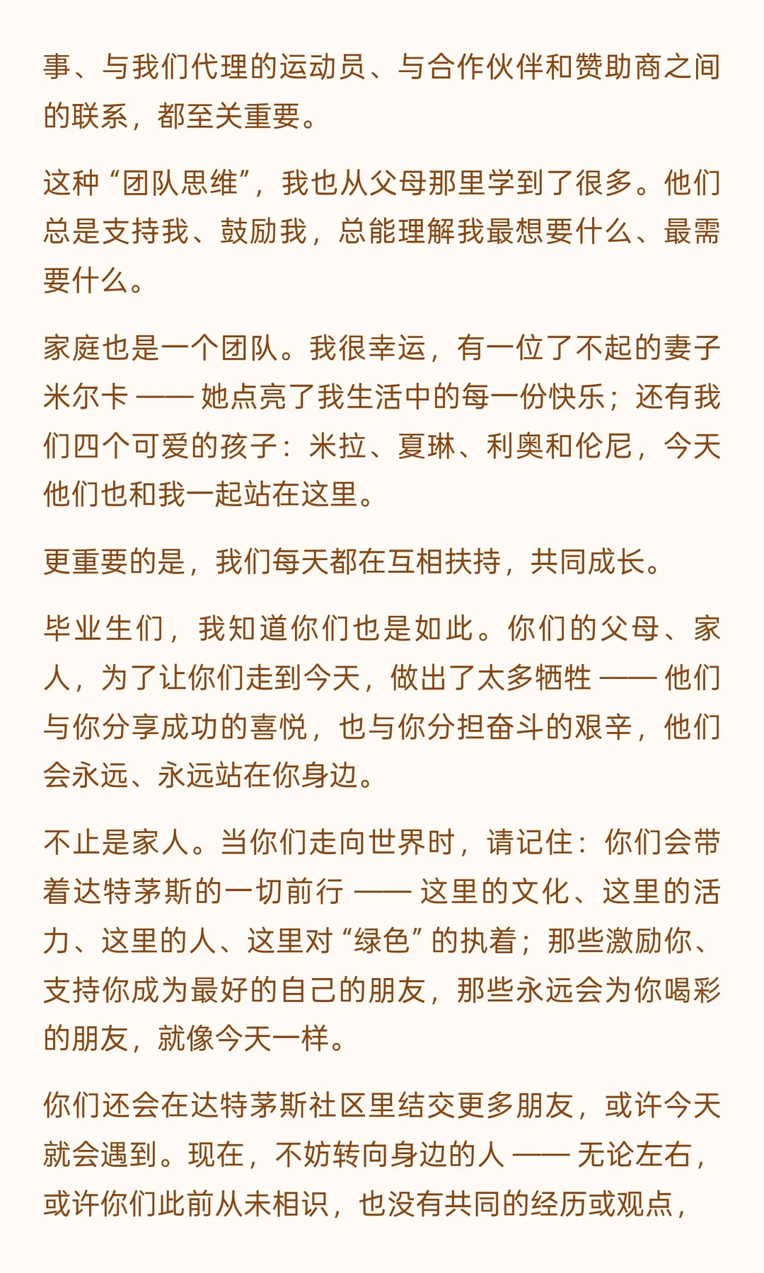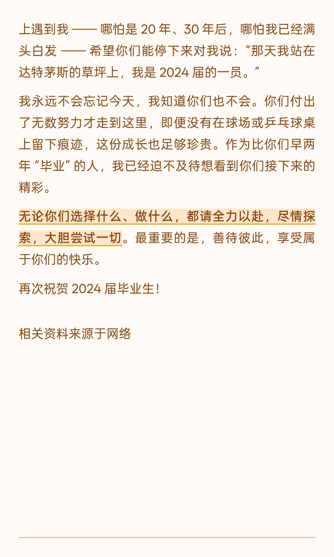 调侃长袍不如短裤自在的幽默、提及达特茅斯乒乓球渊源的亲切、回忆带孩子读苏斯博士的温情,甚至结尾猝不及防的 “正手击球教学”,都让严谨的人生感悟多了份烟火气。