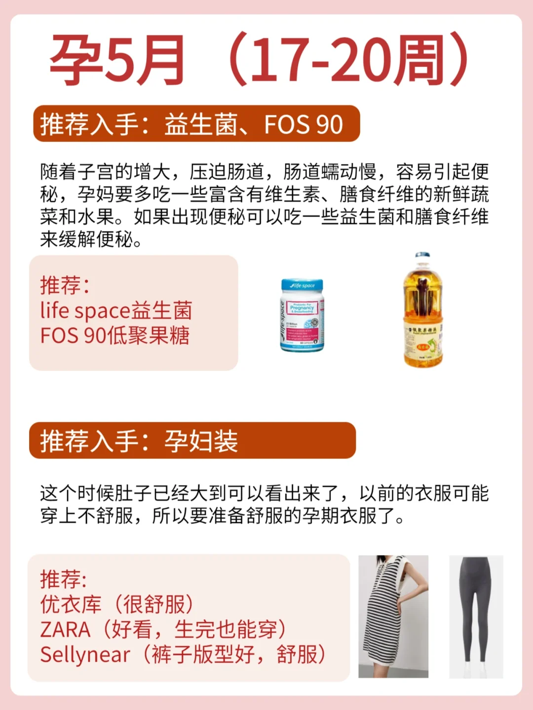 🟢孕5月:益生菌、FOS 90(低聚果糖)、孕妇装,这个时间容易便秘,益生菌、FOS 90可以缓解。