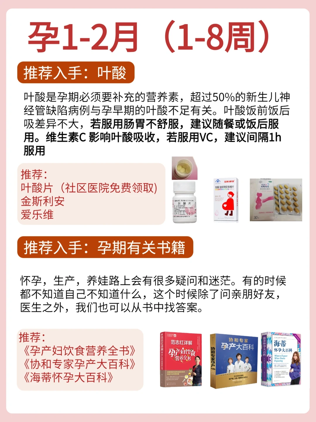 🔴孕1-2月:叶酸(刚需)、钙片(平时不缺钙可以孕4月买)、孕期有关书籍(想了解孕期进程等可入手)