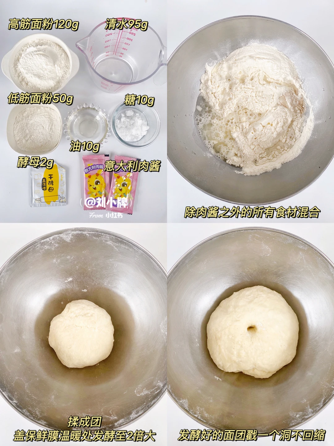 ◻️面团部分:高筋面粉120g,低筋面粉50g,清水95g,酵母2g,糖10g(促进发酵,可不放)油10g
