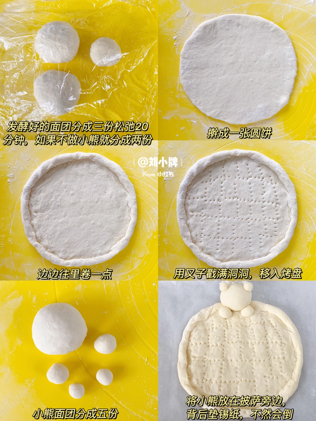 3.将面团擀成圆饼,边边往里卷一点,用叉子扎满小孔,移入烤盘,按照图片上摆好小熊。