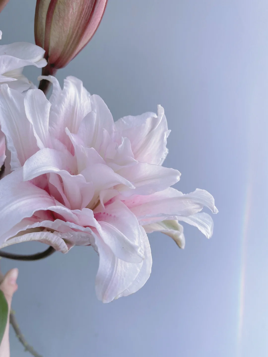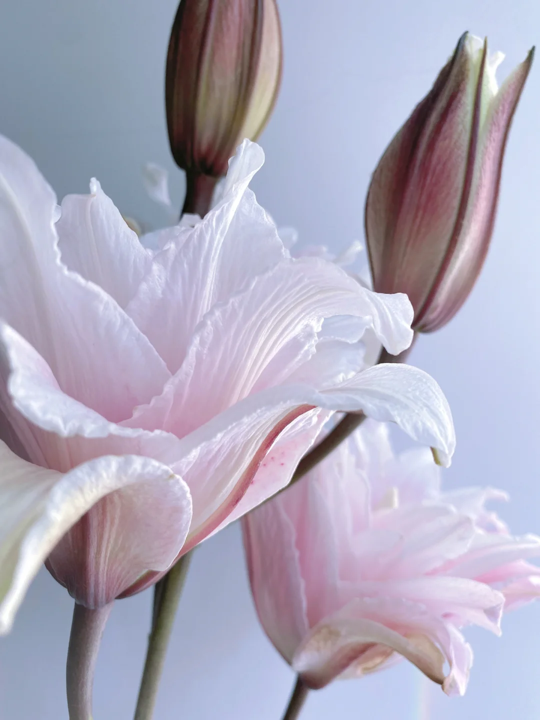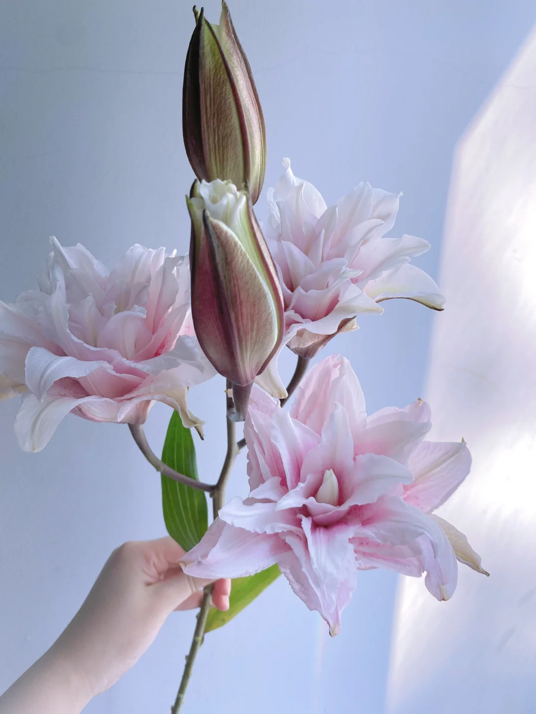 重瓣百合花头硕大,呈大喇叭状,且大部分以多头出现,层层叠叠的花瓣有一点像荷花酥,粉嫩的颜色也很可爱,花期也很长,有香味。很多人都觉得百合很俗,其实百合是非常优雅好看的花材,可能因为在鲜切花中供应量大,历史相对来说比较久,大家都司空见惯了,但是仔细欣赏,它还是很美的花材。