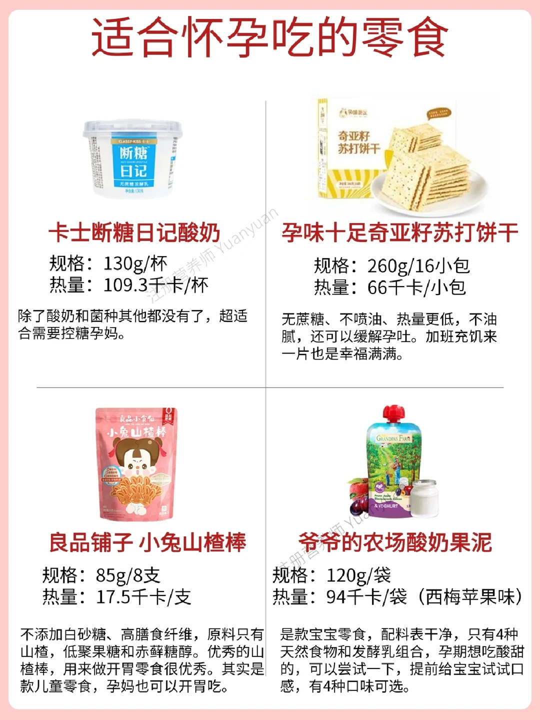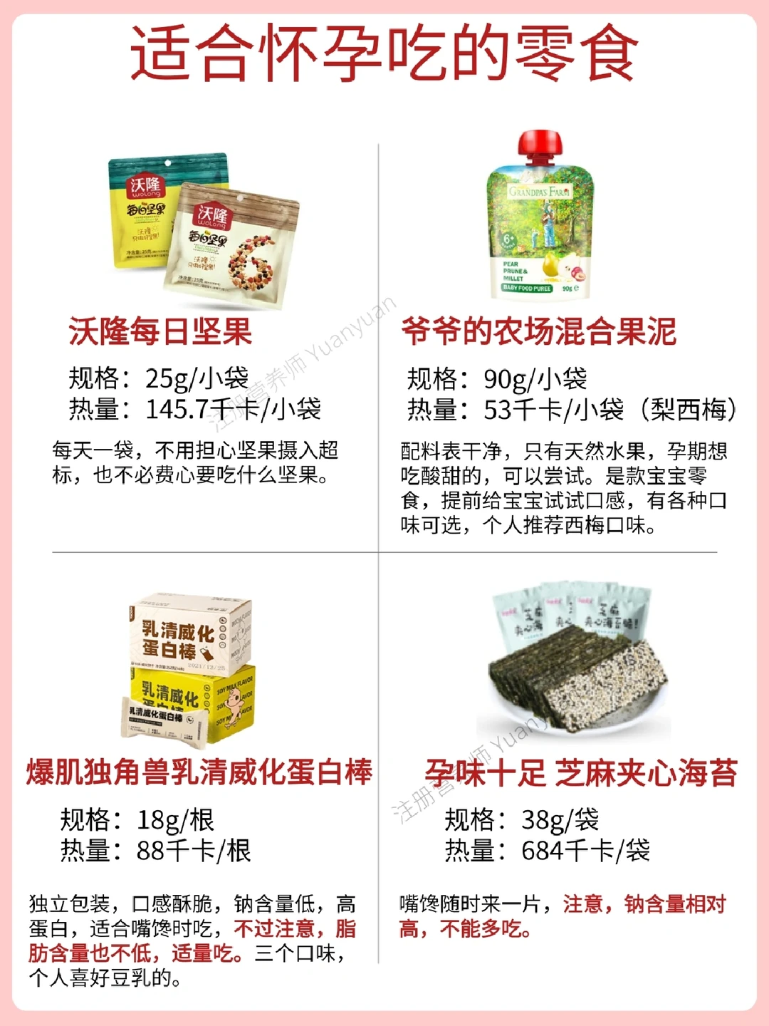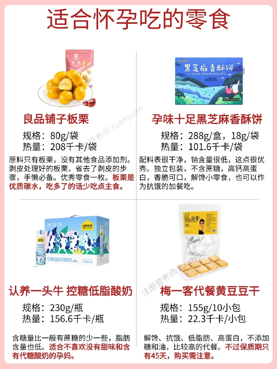 挑选了原则仍然是能量、含糖量、钠含量等相对来说较为适合孕期吃的零食~当大家想解馋也好,或者是偶尔当正餐,可以选择。