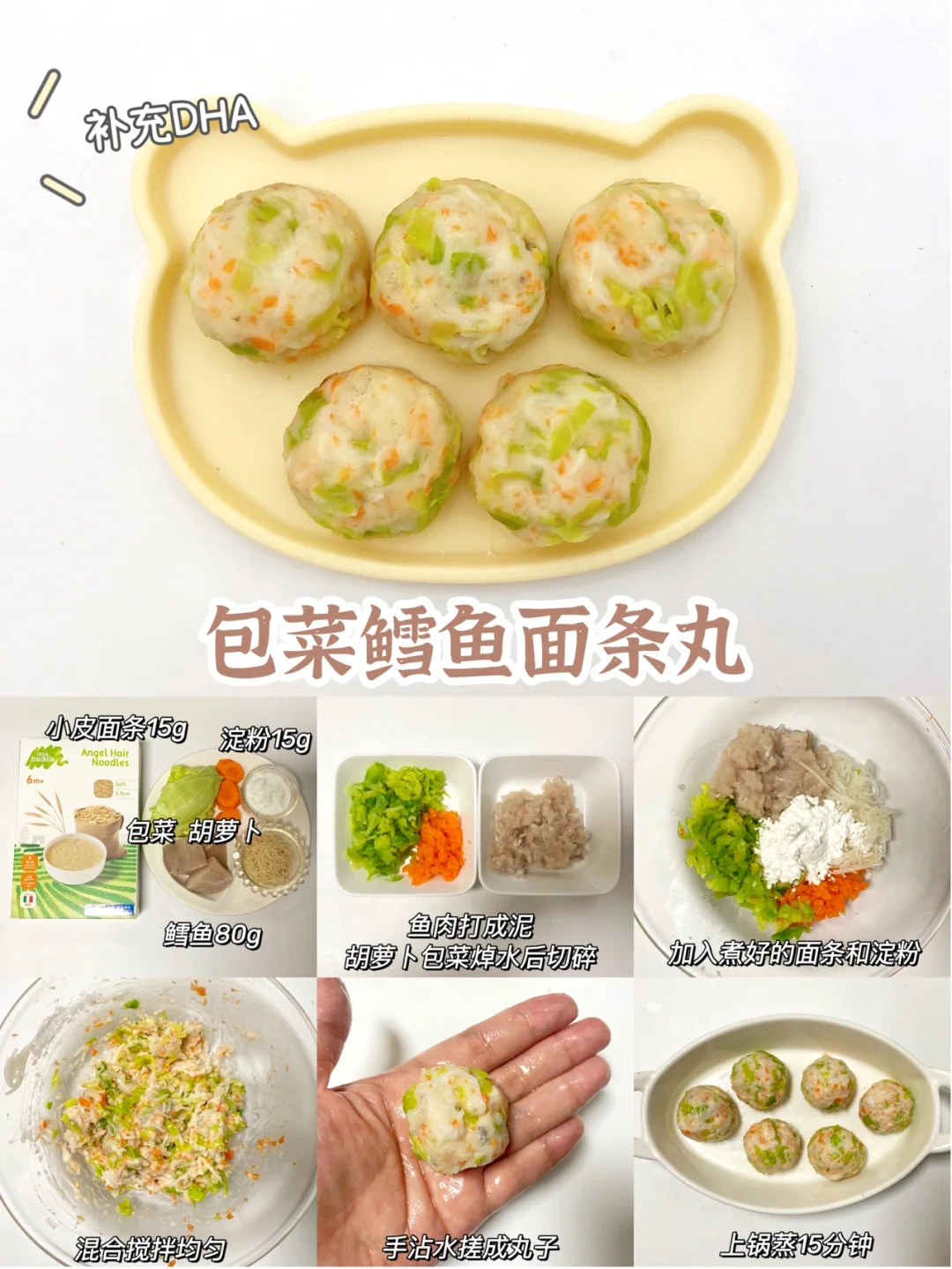 ☑️鳕鱼打成泥,包菜胡萝卜焯水后切碎,面条煮熟沥干水分。将食材全部混合拌匀,将奶酪包入虾泥,上锅蒸15分钟。