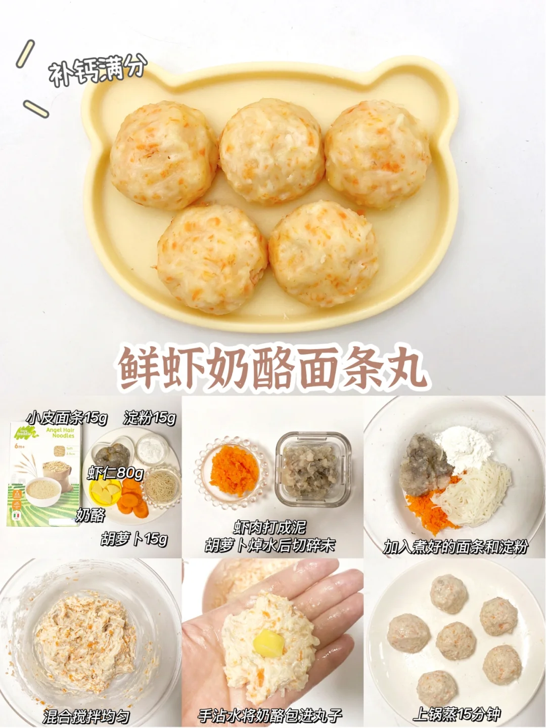 ☑️虾仁打成泥、胡萝卜焯水切碎末,面条煮熟沥干水分。将食材全部混合拌匀,将奶酪包入虾泥,上锅蒸15分钟。
