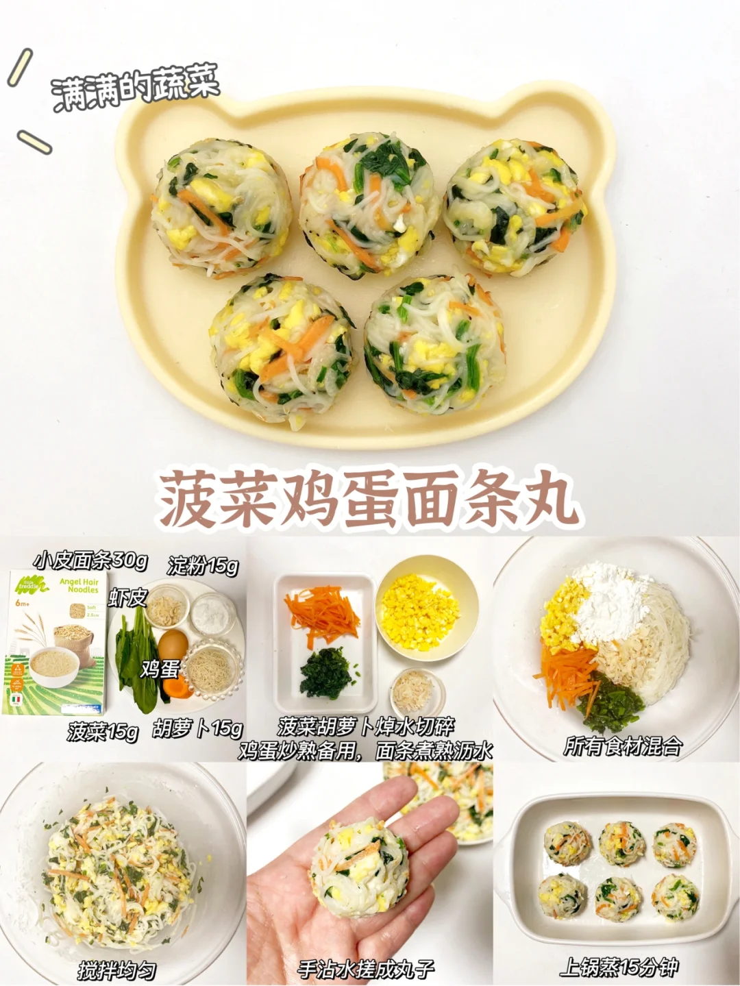 ☑️菠菜胡萝卜焯水切碎,鸡蛋炒熟,面条煮熟沥干水分。将食材全部混合拌匀,手沾水搓成丸子,上锅蒸15分钟。