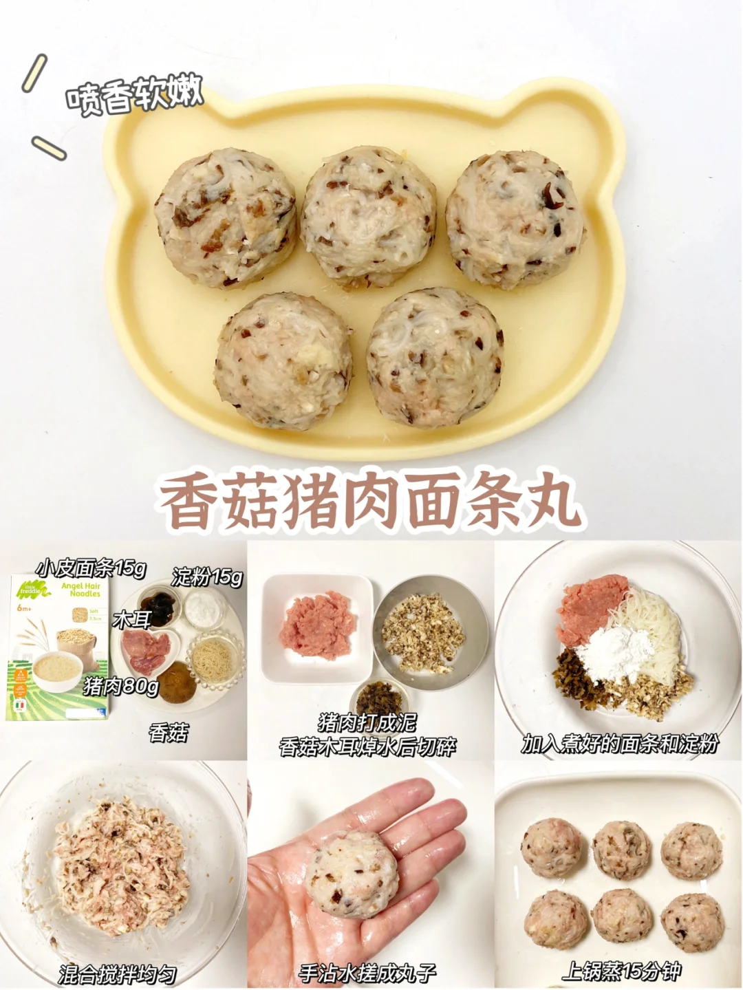 ☑️猪肉打成泥,香菇木耳焯水切碎末,面条煮熟沥干水分。将食材全部混合拌匀,将奶酪包入虾泥,上锅蒸15分钟。