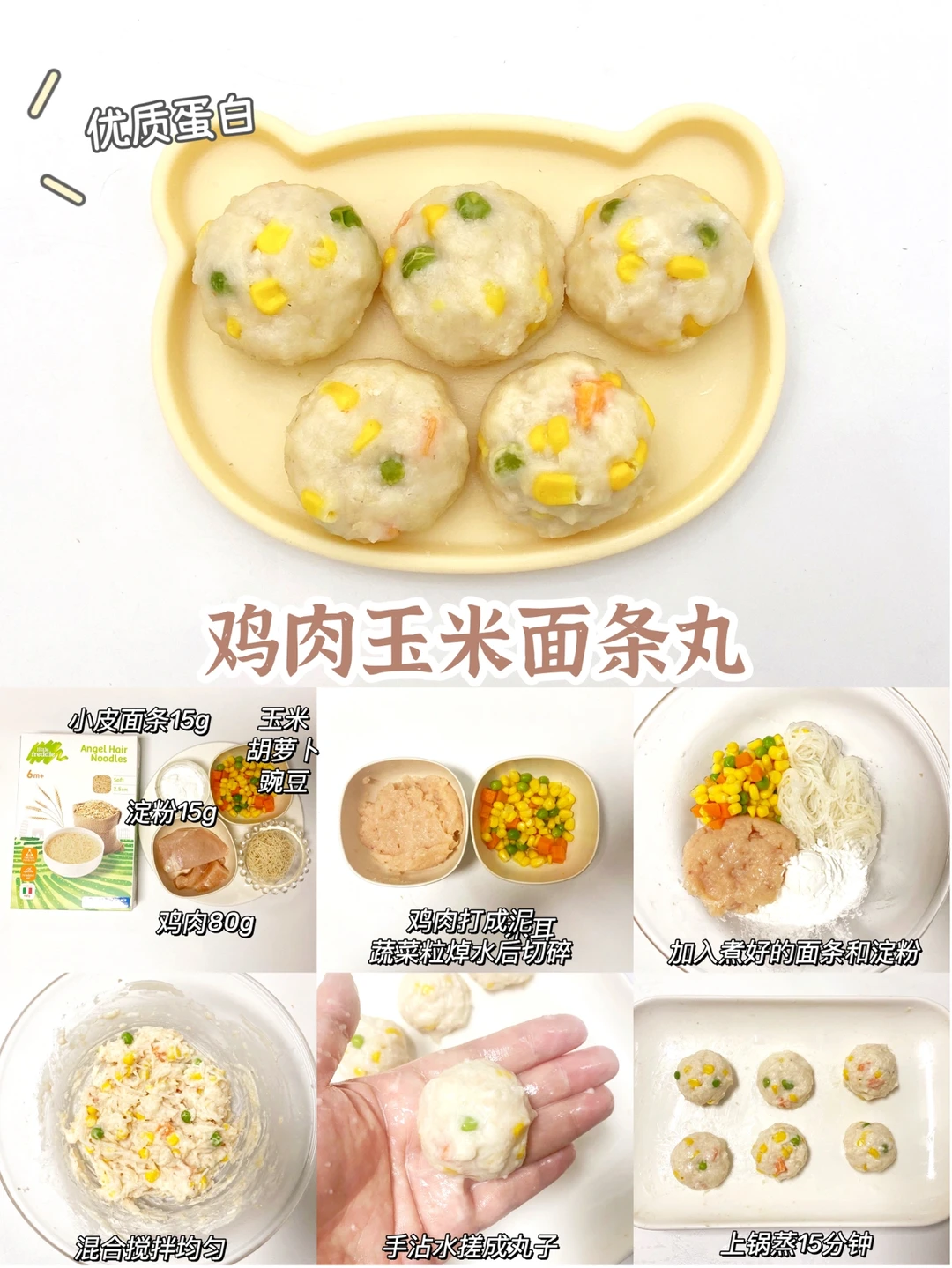 ☑️鸡肉打成泥,蔬菜粒焯水煮熟,面条煮熟沥干水分。将食材全部混合拌匀,将奶酪包入虾泥,上锅蒸15分钟。
