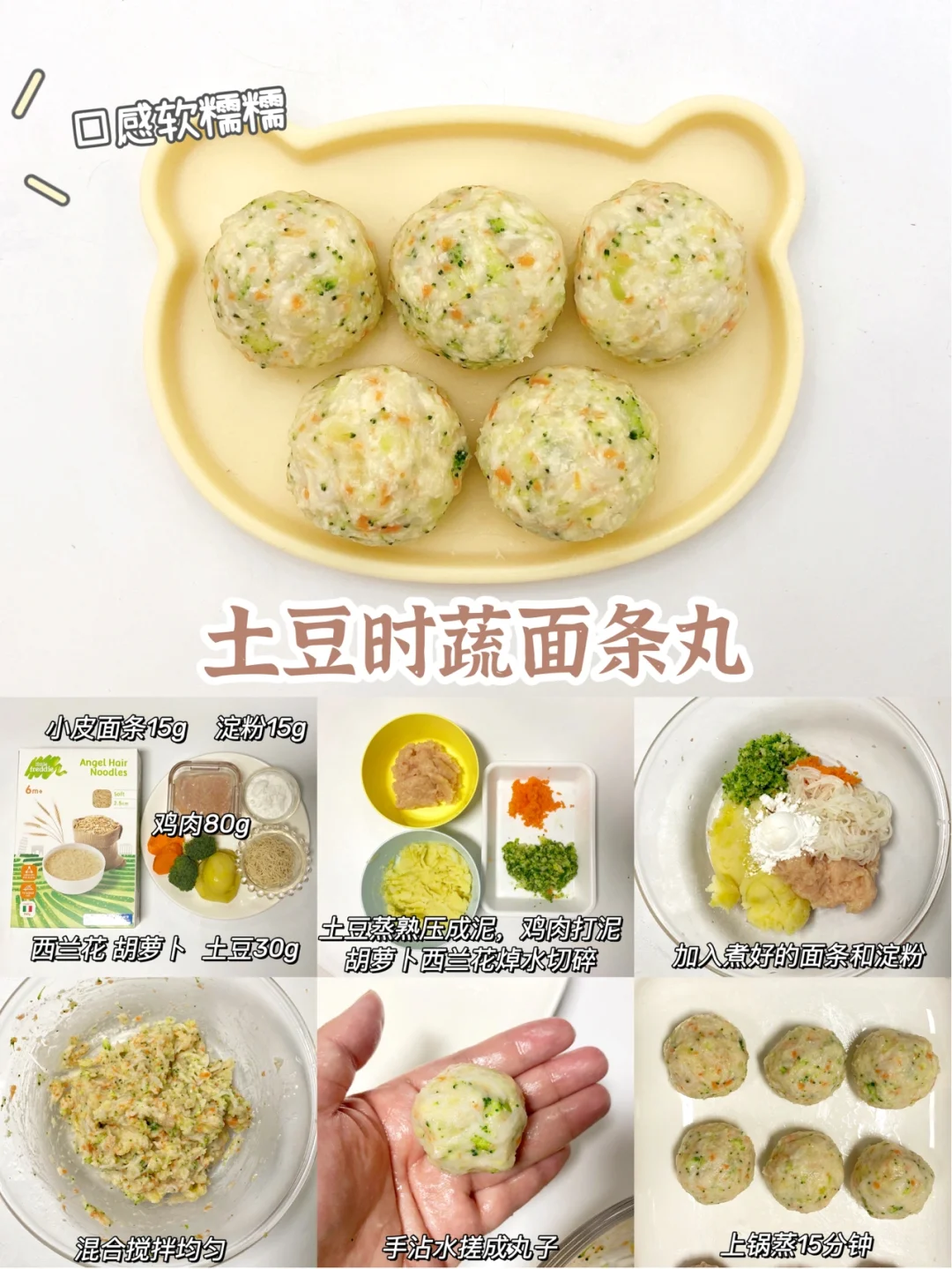 ☑️鸡肉打成泥、土豆蒸熟后碾成泥、西蓝花胡萝卜焯水切碎末,面条煮熟沥干水分。将食材全部混合拌匀,手沾水搓成丸子,上锅蒸15分钟。