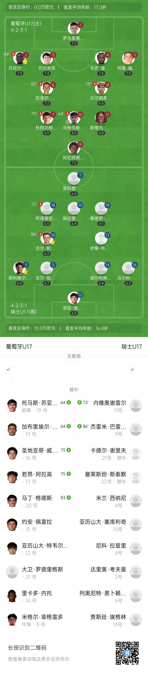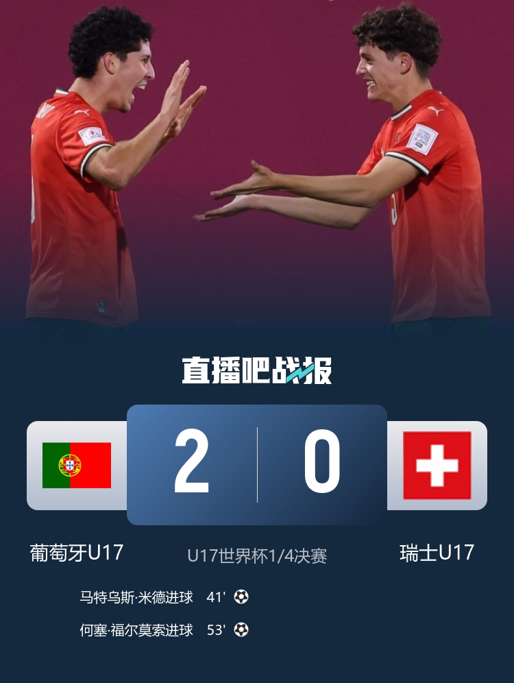 下半场补时7分钟,U17葡萄牙2-0瑞士U17。