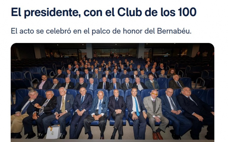 直播吧11月22日讯皇马官网报道,俱乐部主席弗洛伦蒂诺在伯纳乌球场荣誉包厢出席传统“百人俱乐部”午宴,设宴招待俱乐部最资深的会员们。