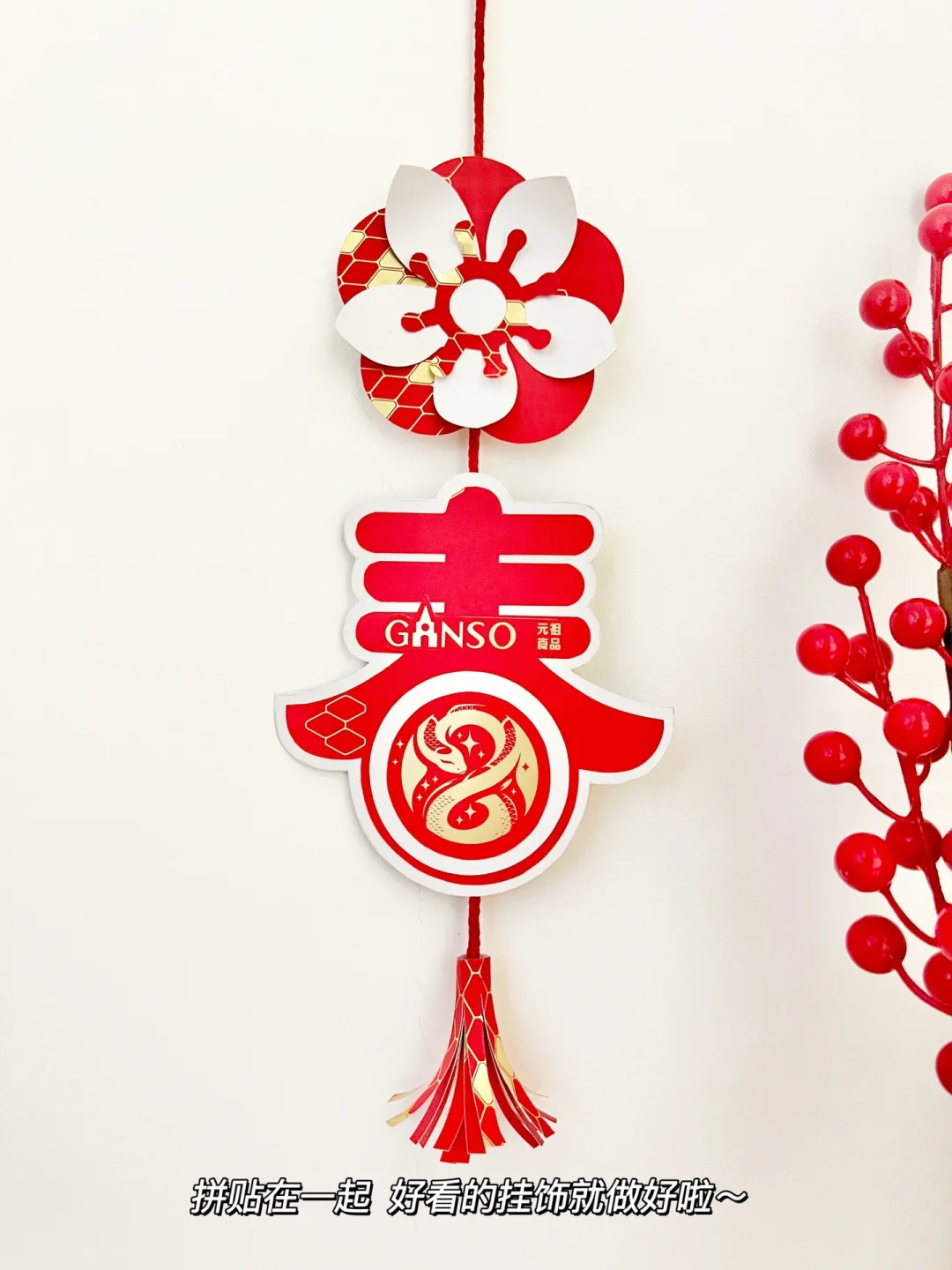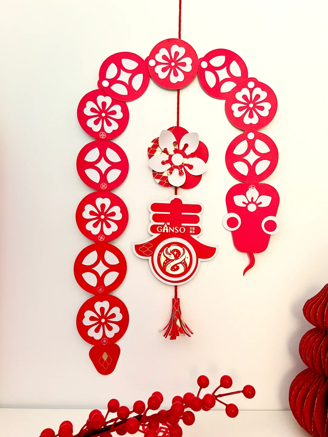 ➡️做法非常简单:将手拎袋剪出若干圆形,红白🔴⚪️数量相等,红色用美工刀刻出图案,贴在白色上面,用链接件串起来就OK啦✌🏻