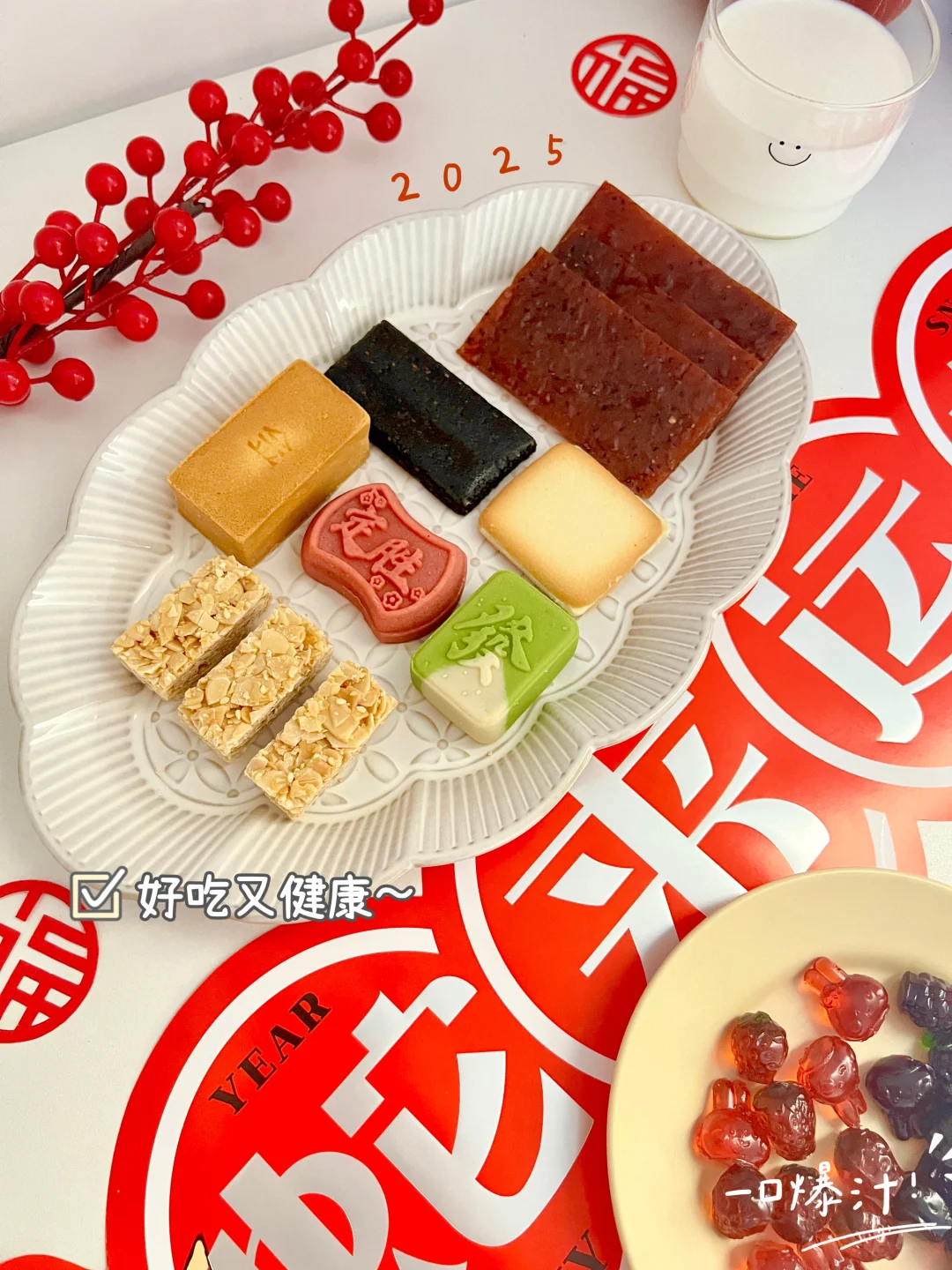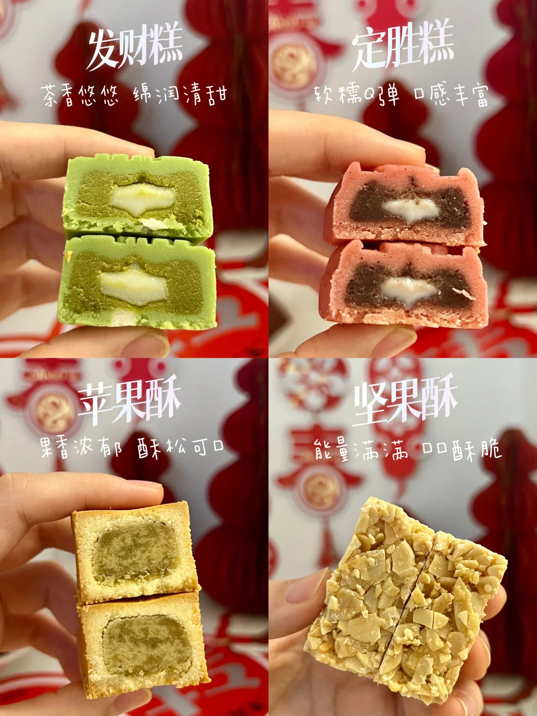 里面有10种点心,超级丰富!有诸事皆胜的定胜糕,金砖造型的苹果酥和香蕉酥🧈,黑芝麻含量超足的奇亚籽黑芝麻糕,一定发财的发财糕、坚果酥🌰、猪肉脯🥩、夹心饼干和袋装软糖🍓~
