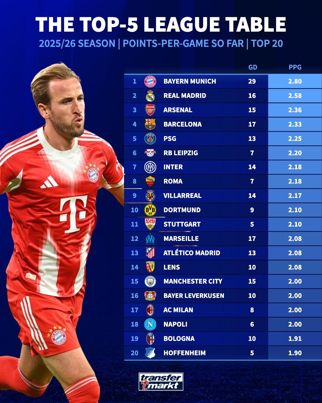 虎扑11月21日讯据德转数据统计,本赛季在联赛中球队场均得分榜,拜仁2.8分第一,皇马、阿森纳前三。