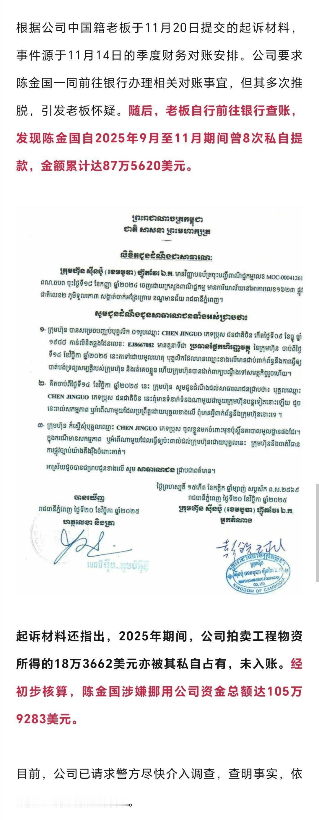 一男子在柬埔寨涉嫌挪用公司近106万美元后失联。