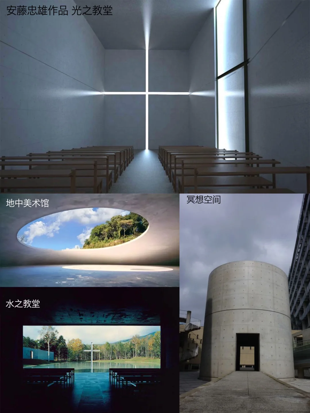 🔹建筑设计最著名的当属安藤忠雄,他利用清水混凝土、光、风与水流,完美呈现出侘寂风格的简朴、自然和质感。