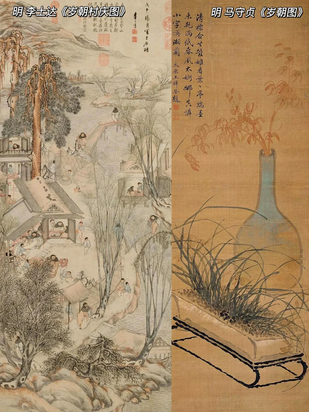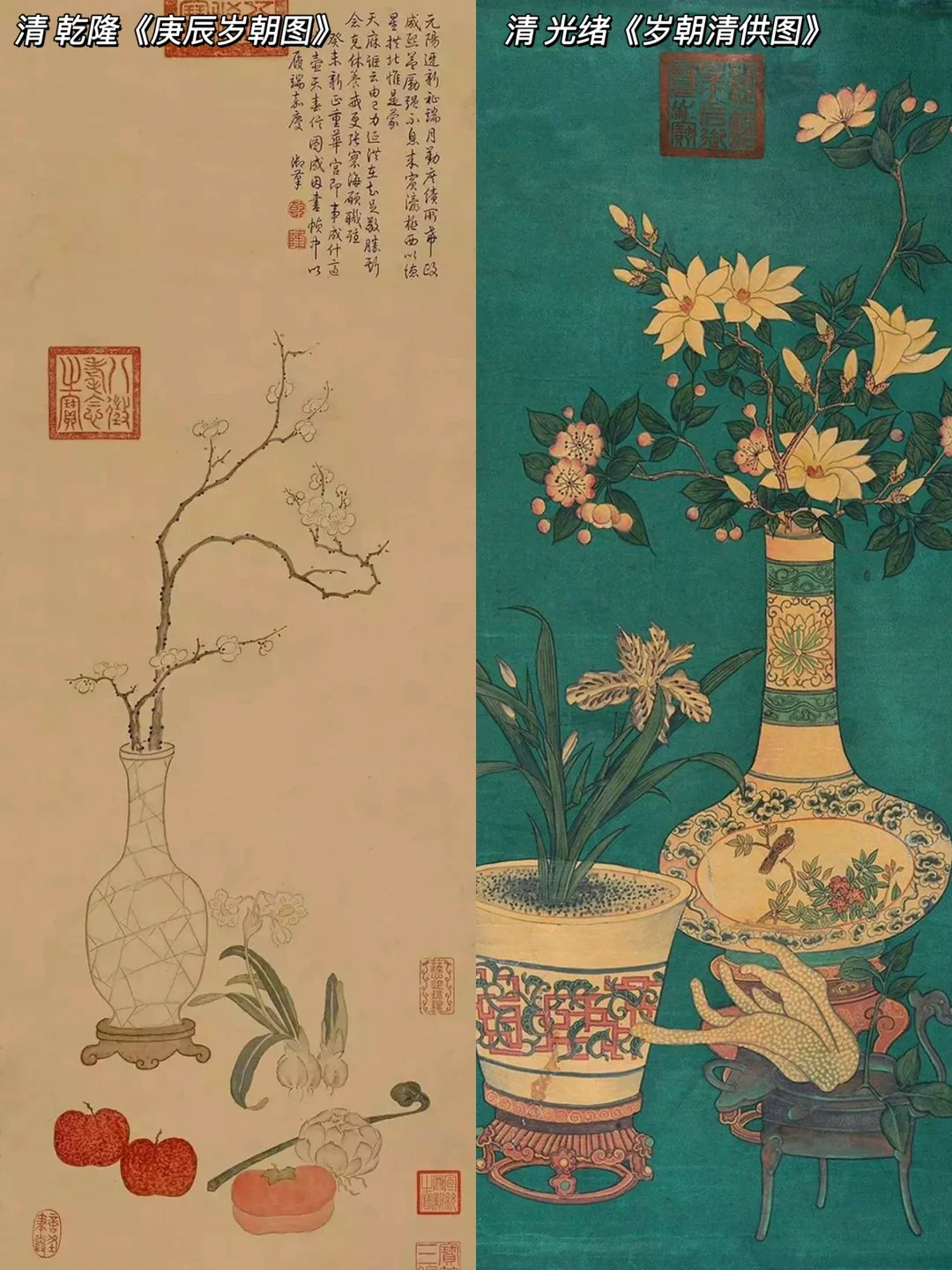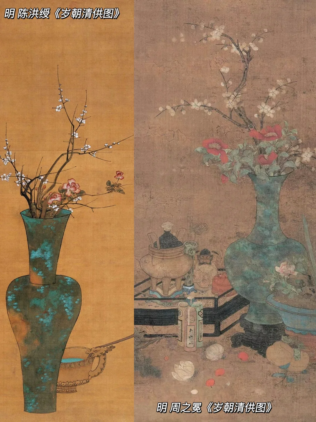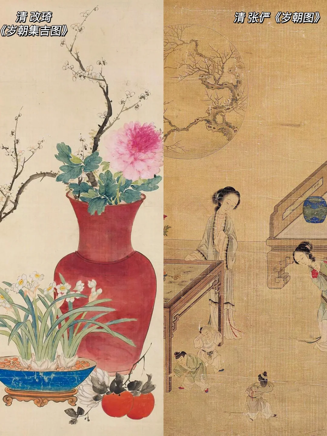 还有传统画花的,瓶花多以梅花、山茶花为主,盆花多以水仙、兰花为主,比如陈洪绶的《岁朝清供图》、马守贞的《岁朝图》、周之冕的《岁朝清供图》等等。