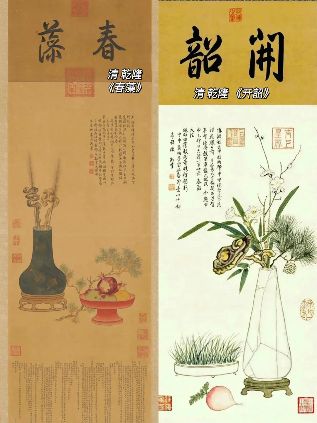 在乾隆的其他岁朝图中,还出现过体现祥瑞吉兆的香橼、吉祥草,应和百事如意的柿子、如意和百合。