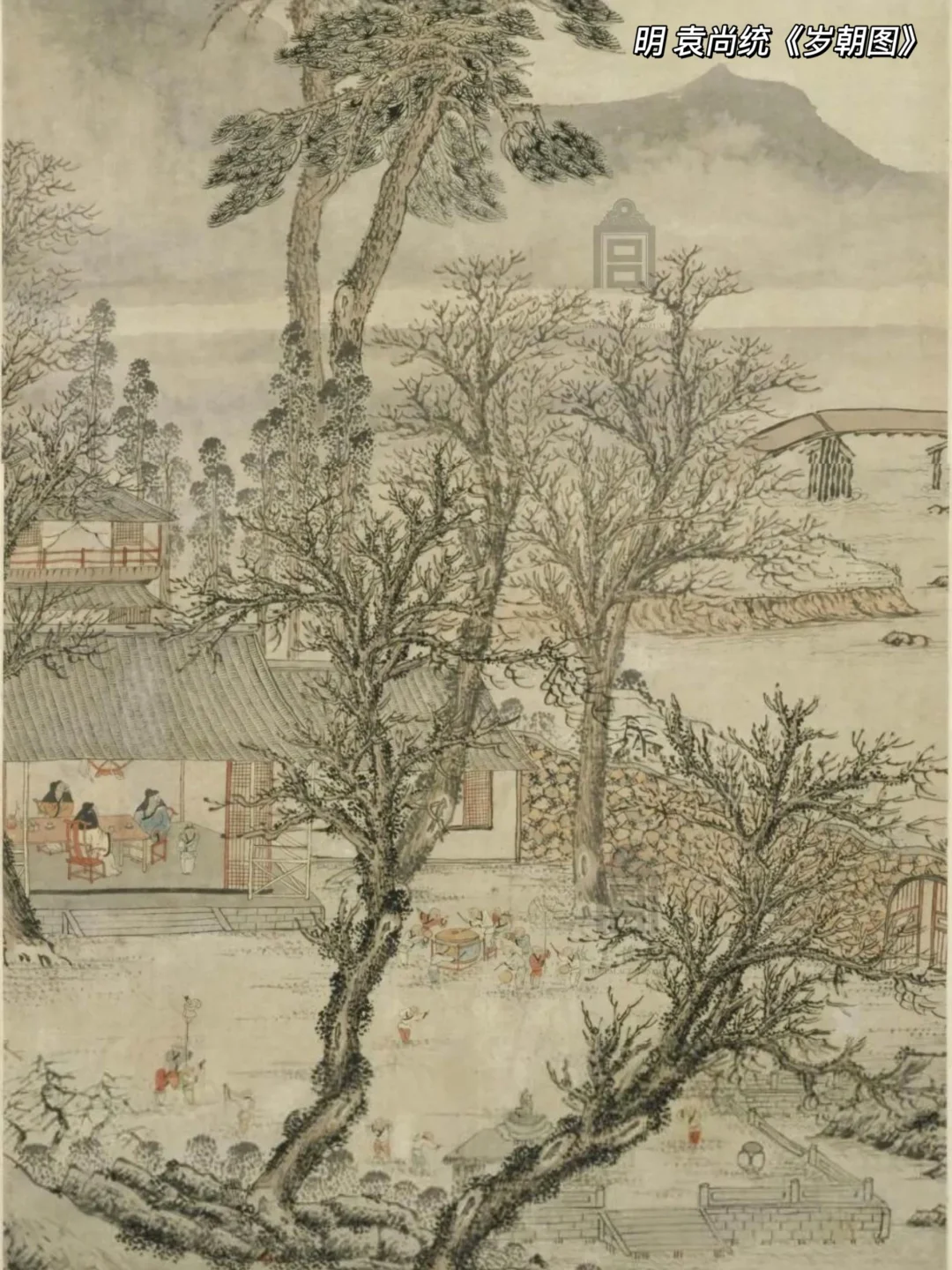 ⛄️还有另一种类型的岁朝图,着重展现的是过年场景,有小孩儿玩儿炮的,堆雪狮子的,铺芝麻杆踩祟的,有大人祭祖、烤火、把酒言欢的,还有文人墨客,以书画相对的。