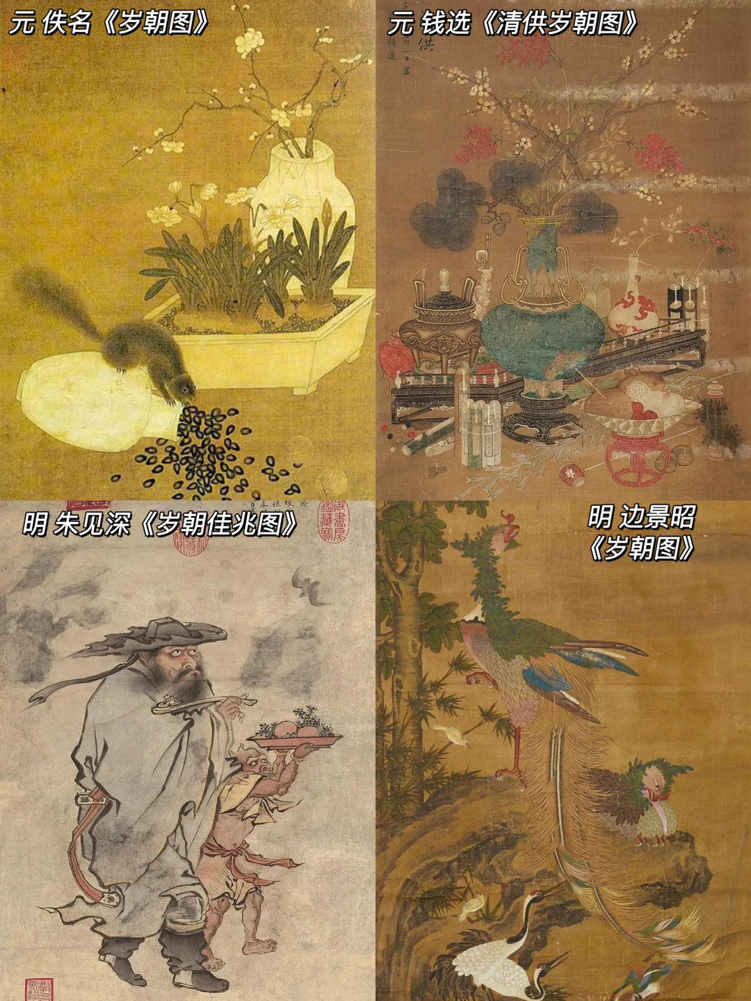 🦇时至明代,在文人墨客的清玩之风中,岁朝图逐渐成型。有画钟馗驱鬼避晦的,比如明宪宗朱见深的《岁朝佳兆图》;有画锦鸡、仙鹤意表富贵、长寿的,比如边景昭的《岁朝图》;