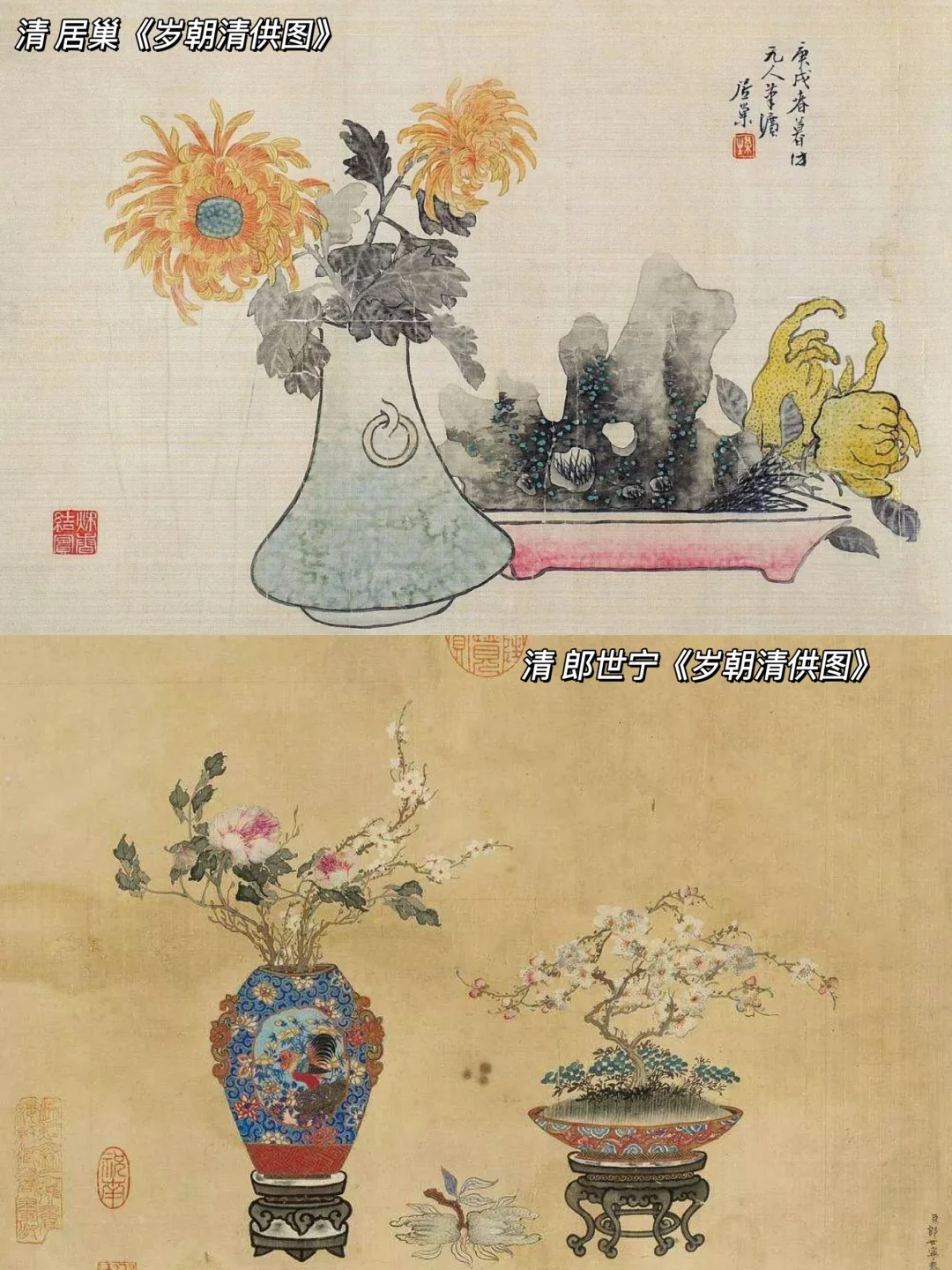 🔥此外,清人还爱在其中增添表达福气的佛手,示意长寿的寿石、菊花,彰显荣华的牡丹花等元素,令一整幅画看下来,好运连连。