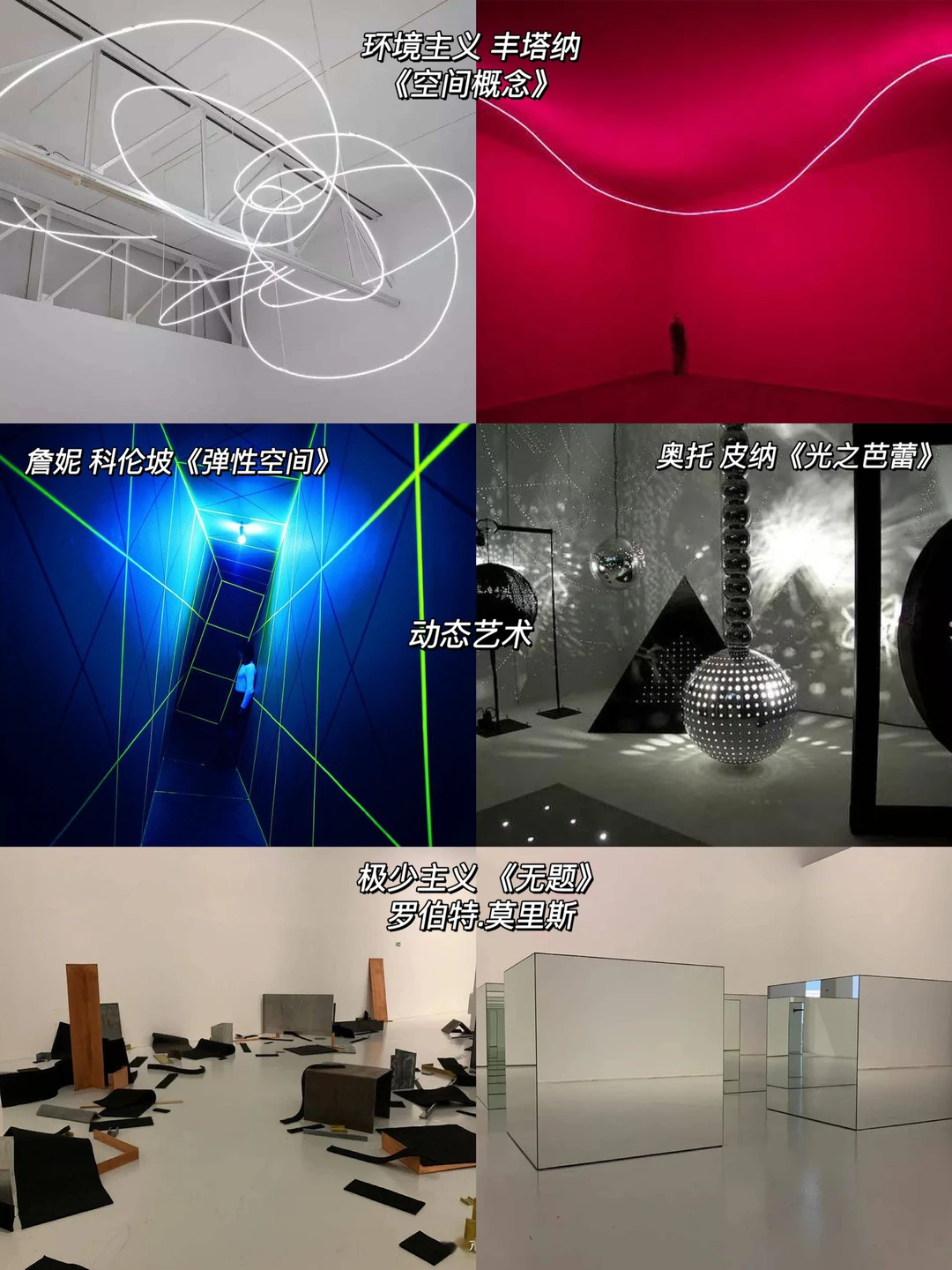 -极少主义多用木头、钢铁和玻璃;过程艺术采用毛毡、融化的铅;