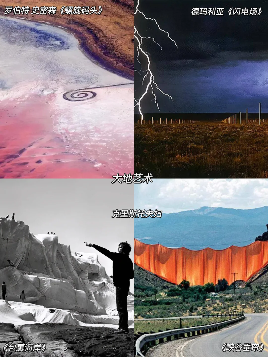 🔸自然界,艺术家们创作出大地艺术。有人在盐湖中堆砌出螺旋状堤坝;有人给峡谷挂上垂帘;有人在原野里矗立起400多支钢针;有人为海岸线包裹上白布。