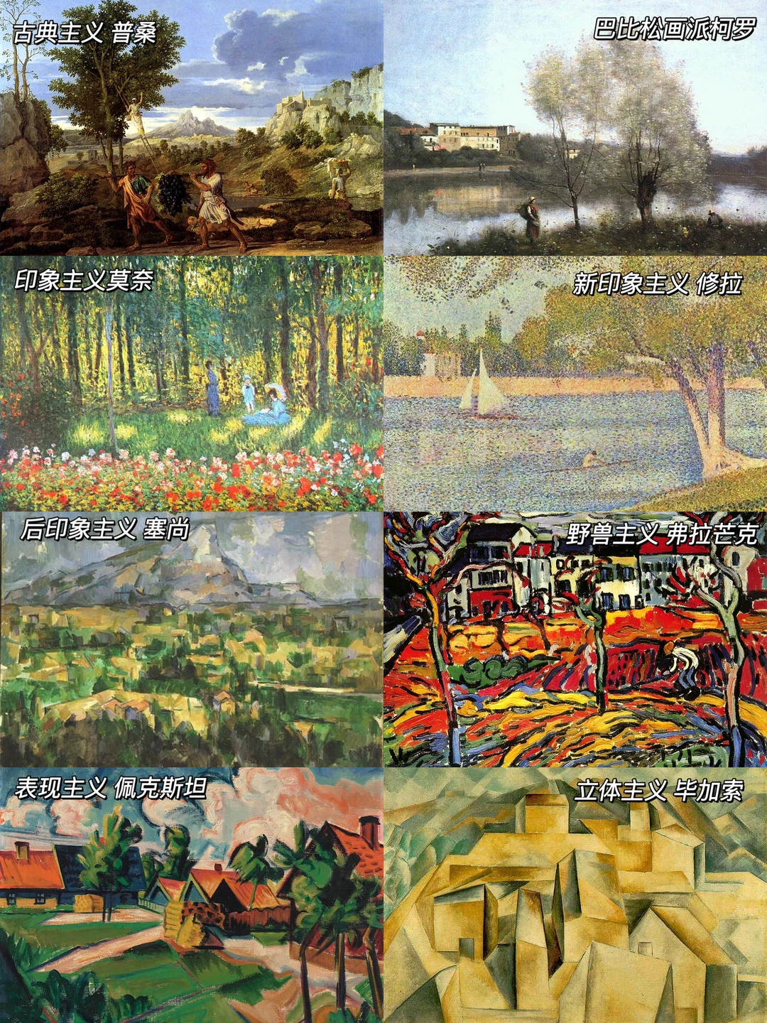 -此后的风景画以各种形式呈现,新印象主义的点画;后印象主义的几何和线条;野兽主义的色彩分割;表现主义的扭曲变形;立体主义的多视角重合。