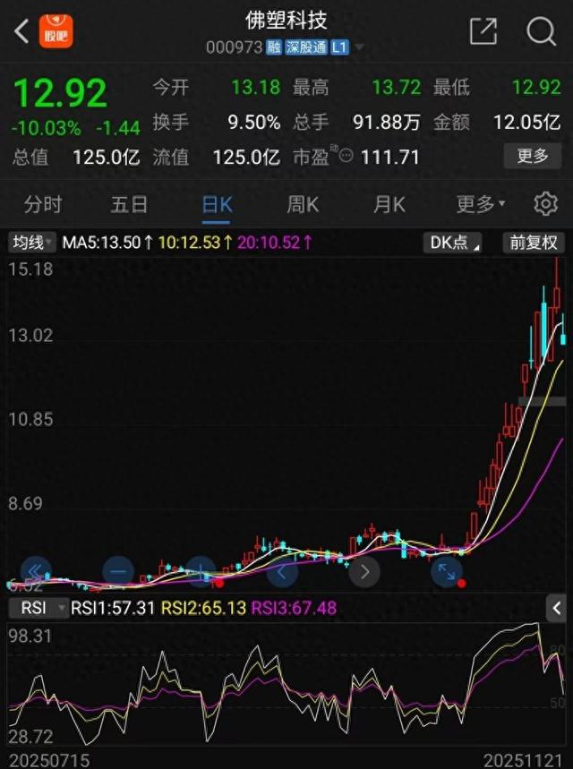 11月以来,佛塑科技整体表现较为强势。11月13、17日和19日,佛塑科技的股价均出现涨停,5天斩获3板。更早之前的11月3日,佛塑科技还出现过一次涨停。截至11月21日收盘,佛塑科技的股价为12.92元/股,本月涨幅高达65.85%,纵观全年表现,2025年以来涨幅接近120%。