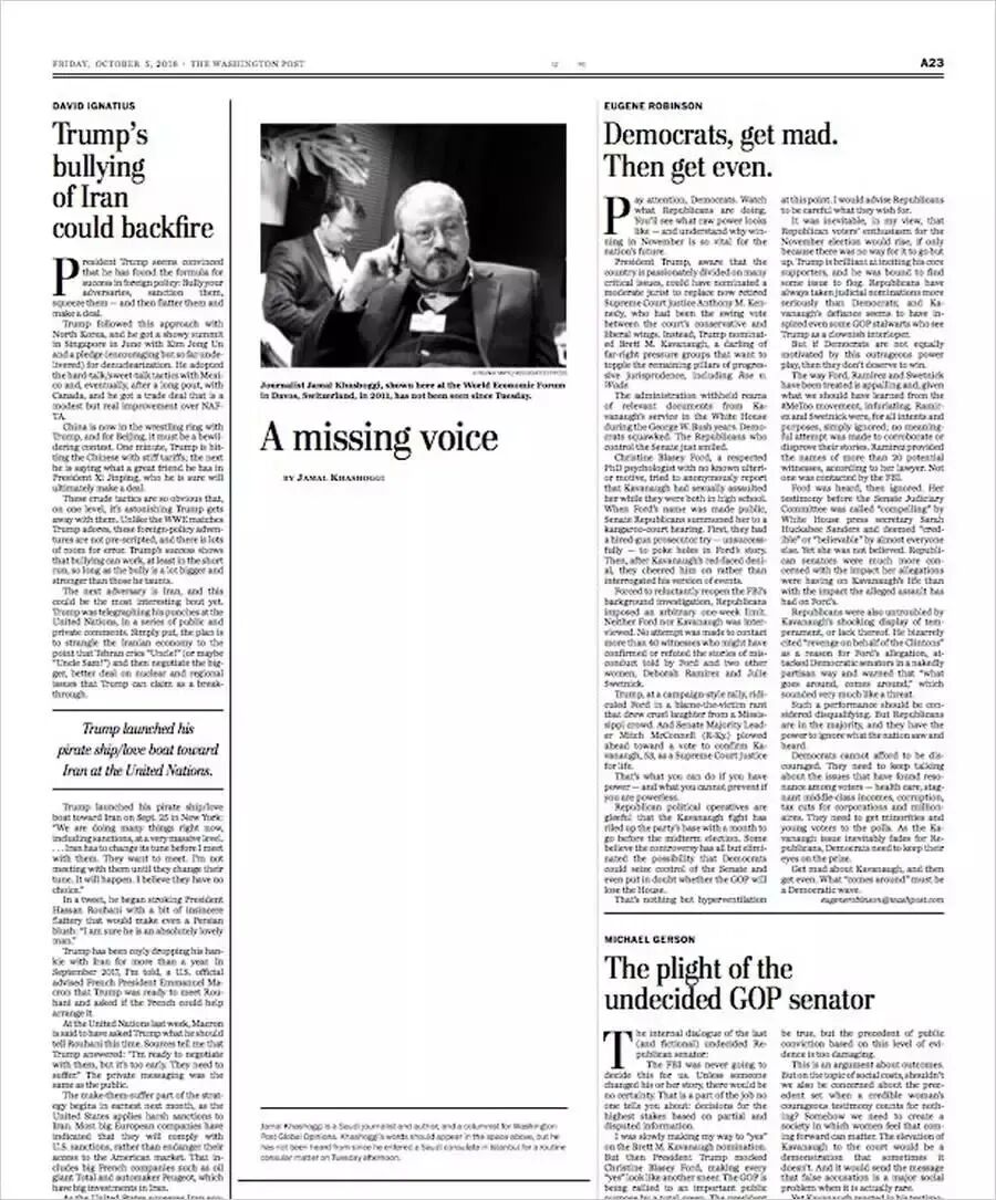 2017年,卡舒吉流亡美国,成为《华盛顿邮报》专栏作家,继续撰文批评沙特政府。他写道:“小萨勒曼大肆抓捕宗教领袖和知识分子,还鼓励百姓举报穆兄会成员。”