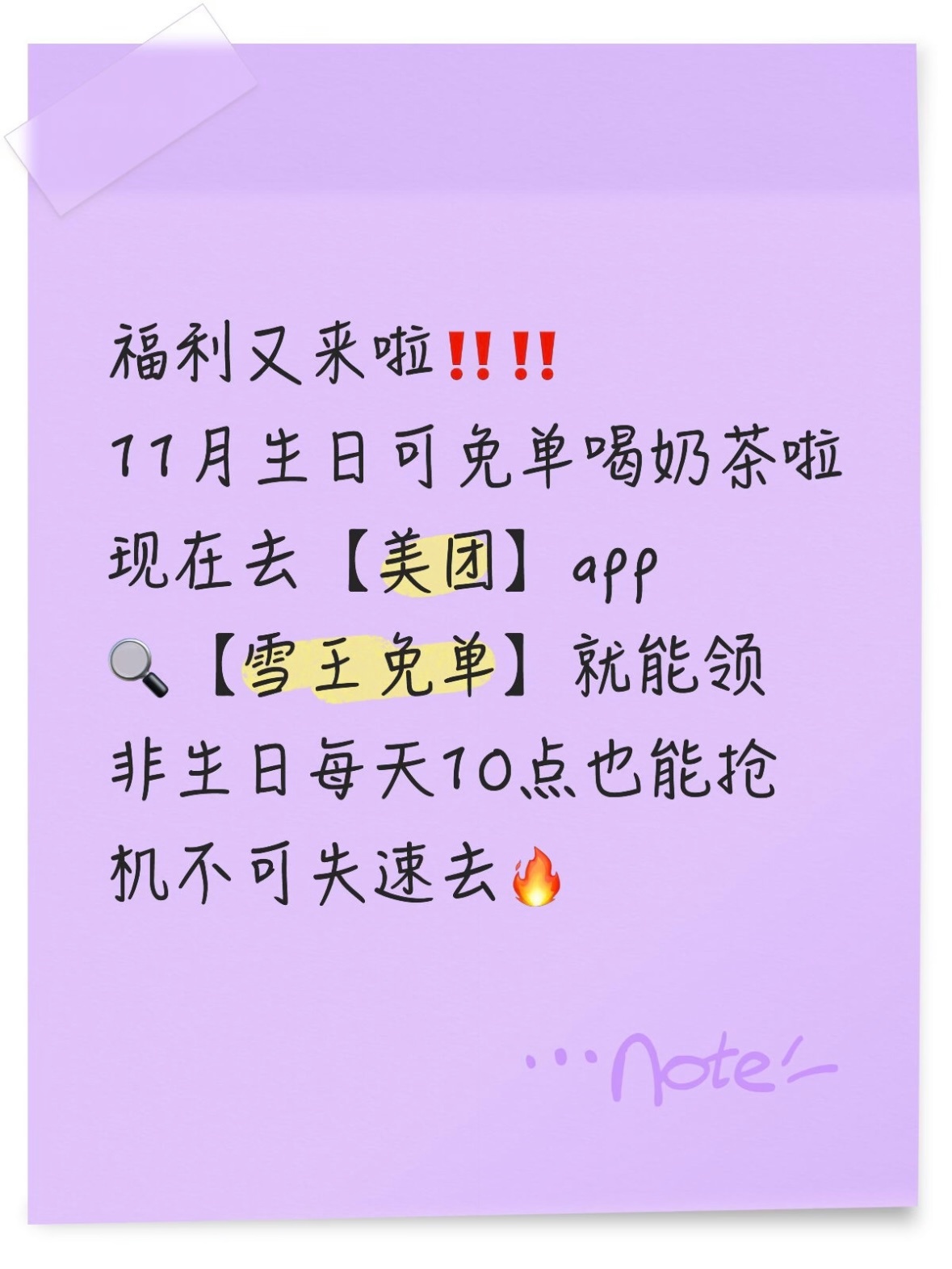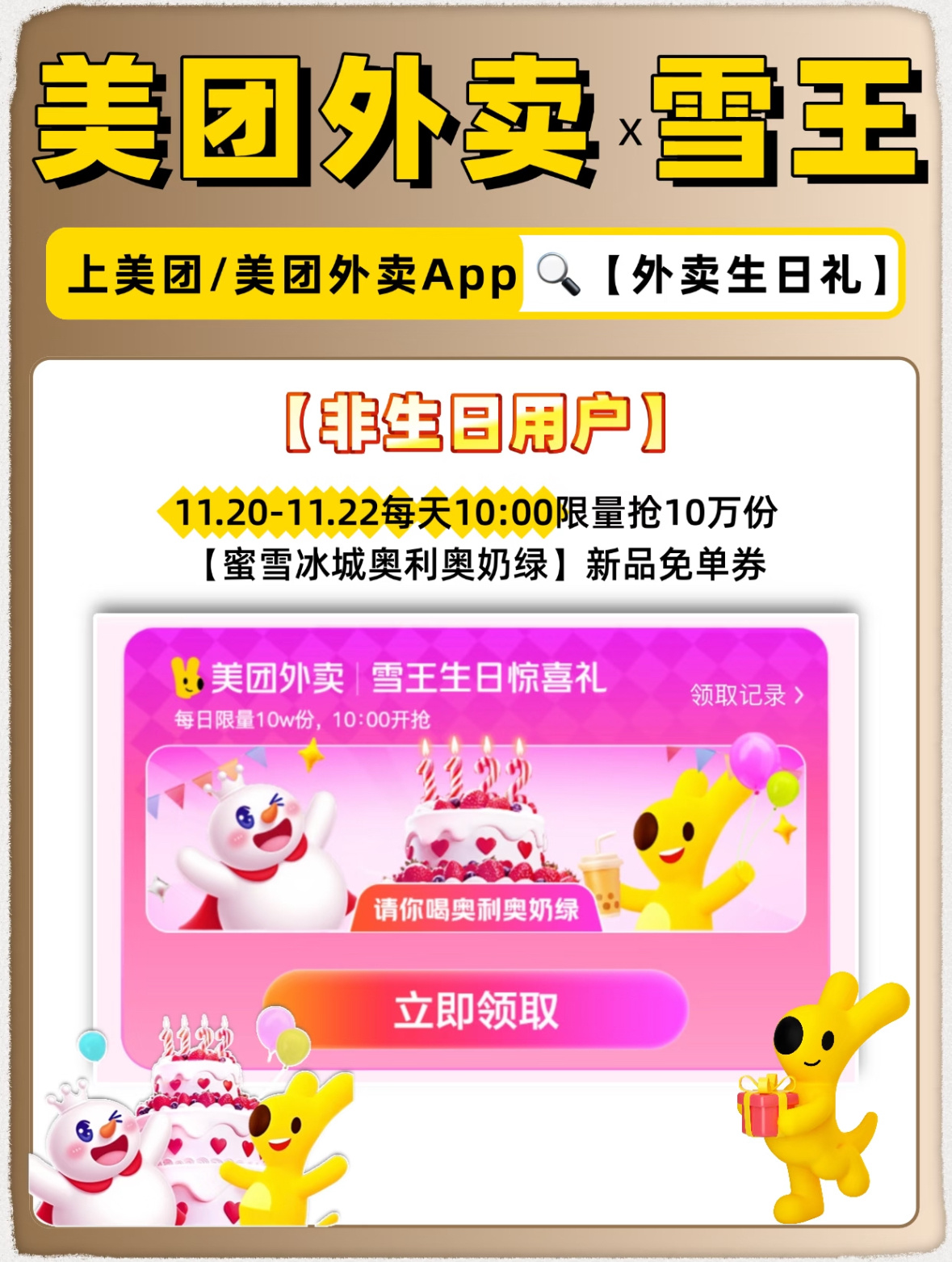 为了给雪王庆生,美团一出手就是大招啊!11月过生日的宝子们,11.20-22日每天100万份蜜雪新品免单券直接领!不是11月生日的宝子们,美团/美团外卖APP直接搜【外卖生日礼】,10点抢10万份奥利奥奶绿免单,还能抽雪王周边和大额券!这个冬天有美团和雪王宠我,真的好温暖啊!