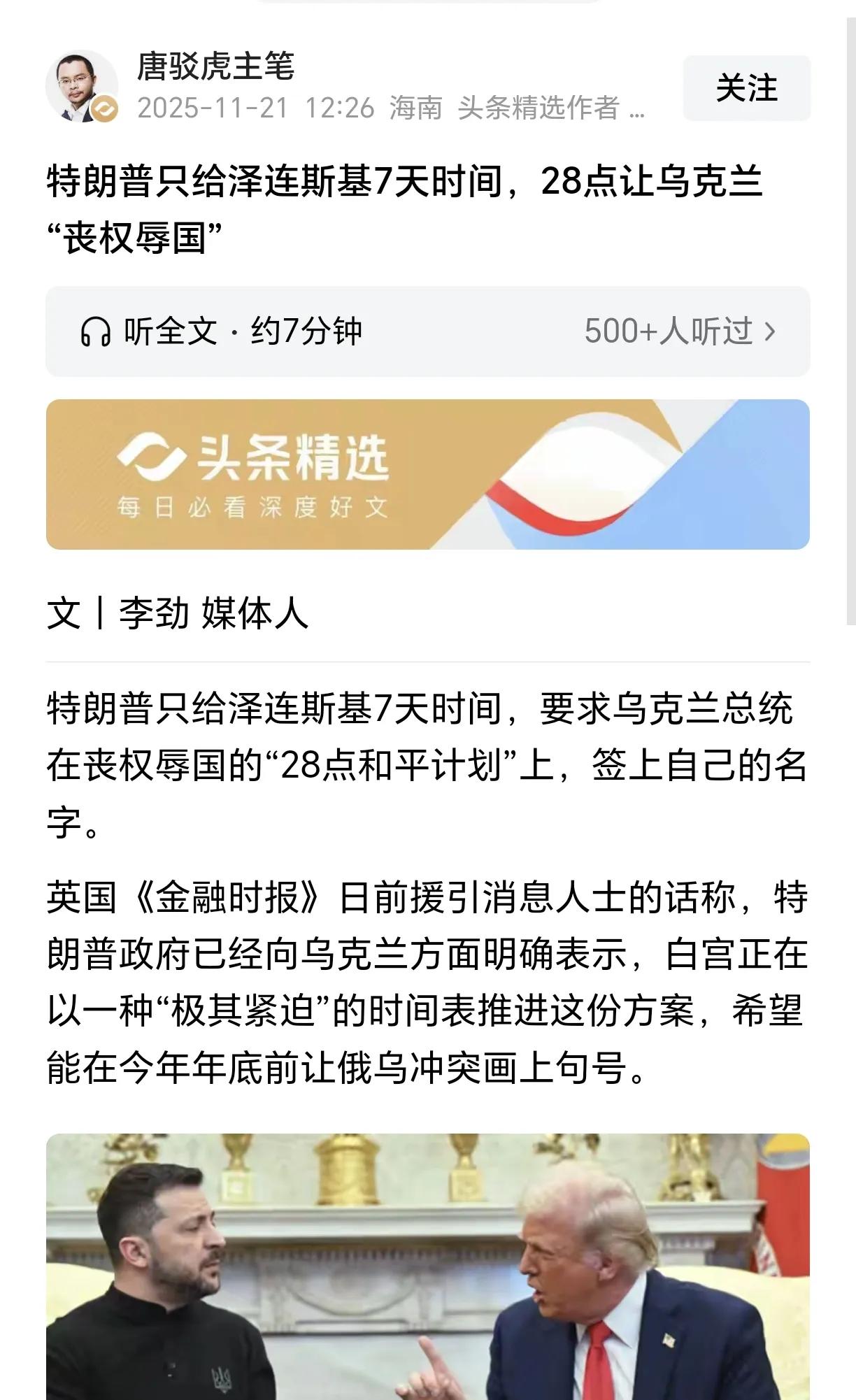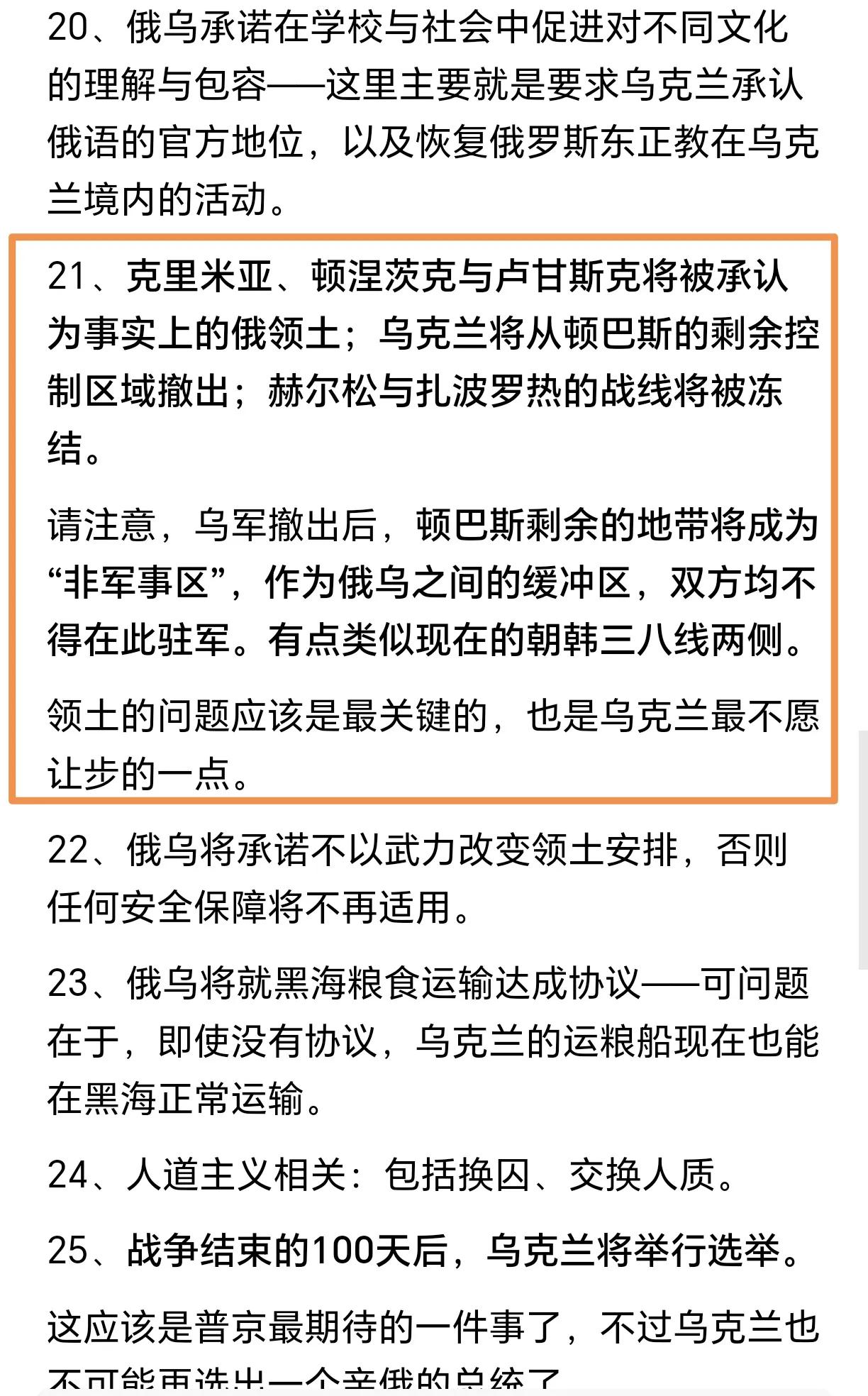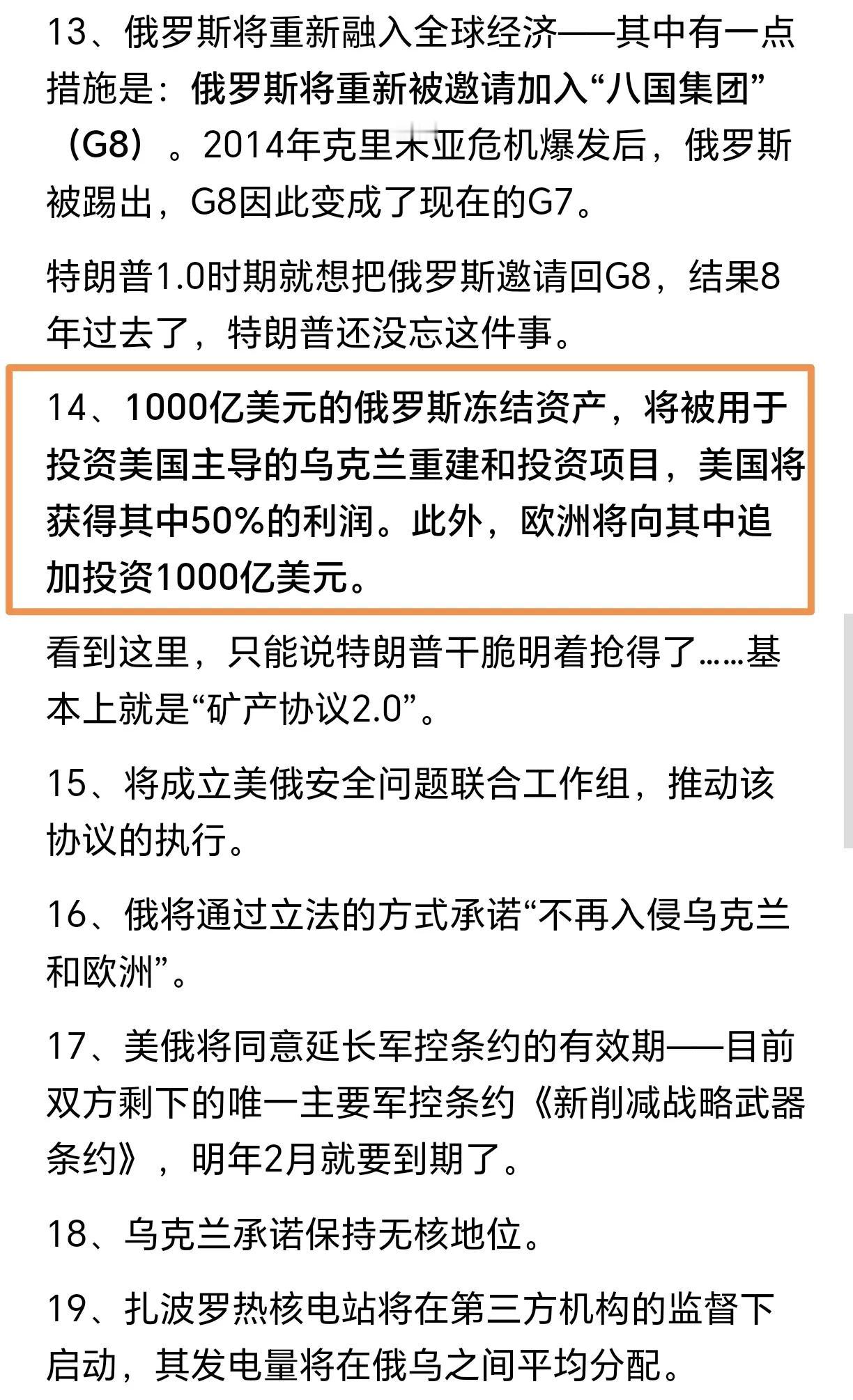 两个国家谈判协商后,拟定要签署一个“和平计划”,要求没参与协商的第三方国家割地、裁军、解除威胁。 没错,这就是最近被曝光的“美俄28点计划”,美国特朗普政府拟以该计划要求乌克兰裁军、割让土地、被限制加入北约,同时美俄欧未来互不侵犯等等。 像极了过去历史上的慕尼黑阴谋等等大国霸权主义条款,不管弱国方是否同意、就把弱国的利益拿来分猪肉。 要是真的达成了,那美国获得了财富、俄罗斯获得了土地、欧洲花钱买来了“和平”,只有乌克兰失去了土地、人口、经济、军力等等。 这也符合当年俄乌战争爆发后,网上大多数人对乌克兰下场的预测。 太阳底下没有新鲜事就是这样。 造成的影响就是乌克兰彻底被瓜分、欧盟的前期投资白费还要再花一大笔钱,美国从中攫取了巨额财富,俄罗斯得到了土地但需要时间消化回血。