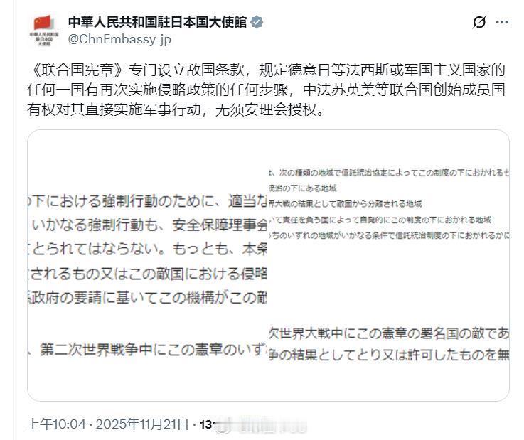中国驻日大使馆在社交平台X用中日双语发帖,向日本全国上下重申联合国宪章之“敌国条款”。在《联合国宪章》中有这么一个专门的条款,规定德、意、日等法西斯或军国主义国家的任何一国有再次实施侵略政策的任何步骤,中、法、苏、英、美等联合国创始成员国有权对其直接实施军事行动,无须安理会授权。,简单说就是只要中、法、苏、英、美等联合国创始成员国,“认为”或者“觉得”,德意日等二战法西斯国家有任何正在准备实施侵略的征兆,无需安理会授权即可直接合法发动攻击。从1957年开始,日本就多次在联合国提出废除“敌国条款”,1995年,日本放弃了修改联合国宪法,利用美国势力如日中天之际,转而推动联合国大会通过第50/52号决议,该决议“认为”敌国条款已经过时,“应该”废止。但是中俄没有点头,肯定没有通过此后。日本对国内就这样足足宣传了30年,日本媒体常引用这一“建议删除”决议作为“废止依据”,弄的现在很多日本人都以为“敌国条款”真的被正式废除了。这种举动和日本多年来修改和平宪法,在教科书上美化侵略历史,扩大自卫队武力的行为是相辅相成的,是一点点去改变二战后的国际秩序规则,用日拱一卒的方式。
