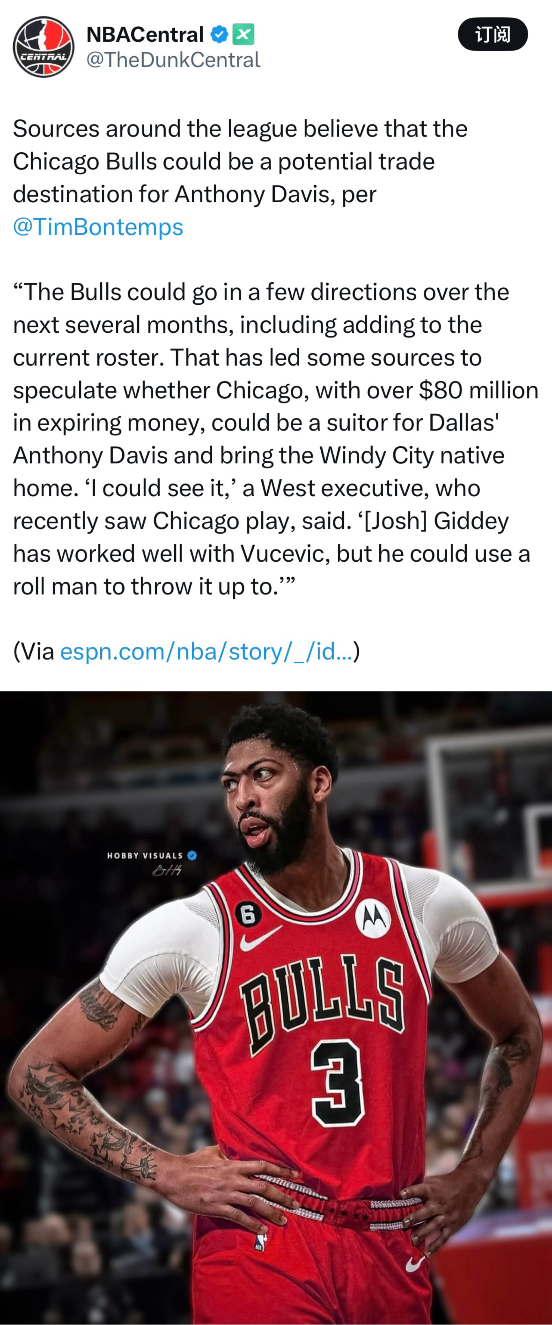 评论员Kendrick Perkins表示,底特律活塞队有意安东尼-戴维斯:“我的消息源还告诉我,底特律方面对安东尼-戴维斯有着浓厚兴趣。”ESPN记者Tim Bontemps:公牛队可能成为安东尼戴维斯的潜在交易下家。“公牛队在未来几个月可能会有多种运作方向,包括补强现有阵容。这让部分消息源猜测,手握超8000万美元到期合同的芝加哥,是否会追逐达拉斯独行侠队的安东尼-戴维斯,让这位‘风城’本地人落叶归根。‘我觉得有这种可能,’一位近期现场观看过公牛比赛的西部球队高管表示,‘约什-吉迪和武切维奇配合得不错,但他还需要一个能顺下接球终结的球员。’”