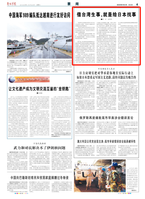 连日来,日本媒体和各界有识之士纷纷对高市早苗涉台挑衅狂言提出告诫和批评。台湾光复已经80年了,台湾是否有事,根本不是日本的事。然而,日本方面仍有人不思反省、狂言挑衅。正告以高市为代表的右翼势力,与其鼓吹“台湾有事,日本有事”,不如谨记,借台湾生事,就是给日本找事。