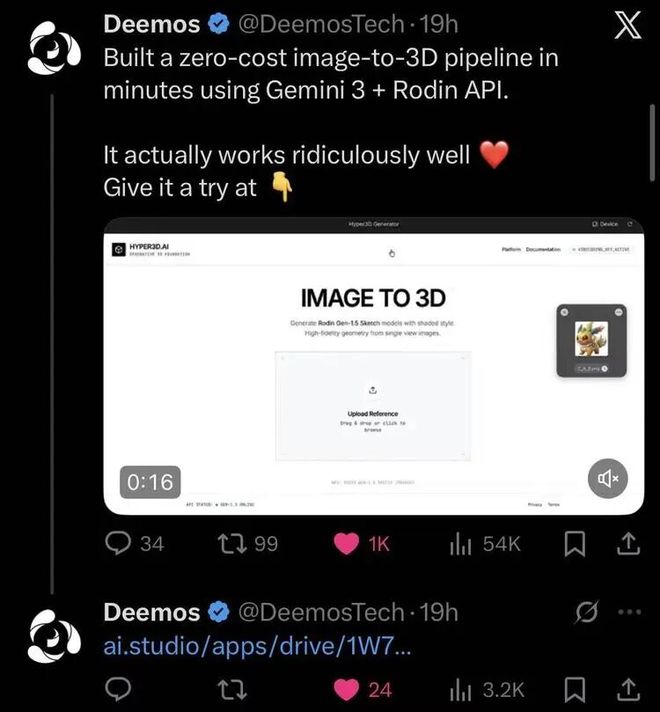 Hyper3D.AICTO张启煊:Gemini3所展现出来的,其实用“3D生成能力”去描述是有一些问题的。目前大家看到的Gemini3的“3D生成案例”,其实无非是从网上下载一个3D模型、用代码生成参数化的简单3D模型、用代码描述体素这三类。
