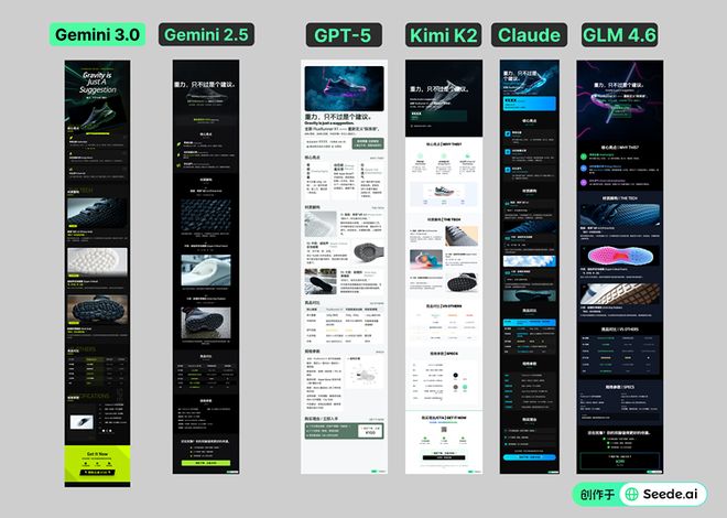 杨沐锦:我感觉像是“吉卜力”时刻,我们自己测下来,Gemini3的一个很大的提升是审美能力。以下是我们用同一个Prompt做的一个对比图: