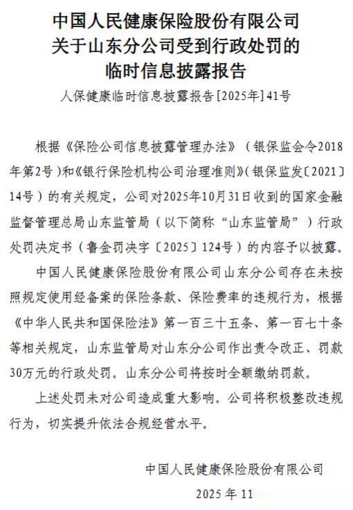 对于该项处罚,人保健康指出,中国人民健康保险股份有限公司山东分公司存在未按照规定使用经备案的保险条款、保险费率的违规行为,根据《中华人民共和国保险法》第一百三十五条、第一百七十条等相关规定,山东监管局对山东分公司作出责令改正、罚款30万元的行政处罚。山东分公司将按时全额缴纳罚款。上述处罚未对公司造成重大影响。公司将积极整改违规行为,切实提升依法合规经营水平。