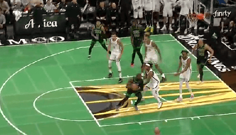 比赛的第四节,杰伦-布朗抢下前场篮板,漂移后仰高难度中投命中。
