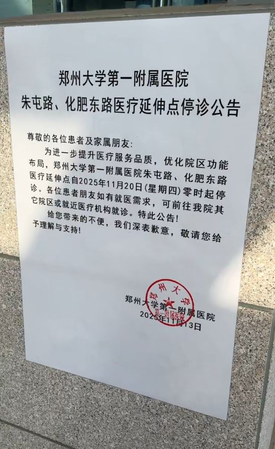 今年11月13日,郑大一附院订阅号发布公告,称医院朱屯路、化肥东路医疗延伸点(指西院区)将自11月20日起停诊。