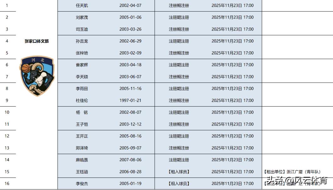重磅!张家口首支职业篮球队成立! 据深蓝体育消息,2025-26赛季全国男子篮球联赛(NBL联赛)国内球员注册于昨天截止。其中在名单中出现了张家口体文旅的名字。这就意味着张家口首支职业篮球队将在新赛季参加NBL联赛。同时,也标志着在新赛季的NBL联赛中将首次出现两支河北球队同场竞技。 据悉,张家口体文旅篮球俱乐部由张家口体文旅产业发展集团旗下的张家口全季体育赛事策划有限公司投资成立,注册资金100万。球队logo为“山羊”,主场大概率设在张家口学院平门校区体育馆 。目前球队注册国内球员16人,其中从CBA联赛浙江广厦和新疆广汇租借了两名年轻球员。