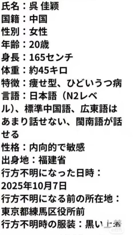 日本失联女孩~寻人 留学生:吴佳颖女孩二十岁,在日本东京留学,现在失联多日状态,家人很着急,有在日本的同胞帮忙寻找,赠人玫瑰🌹手留余香!日本 日本失踪 发笔记问问大家 日本旅游 东京留学生 东京 日本旅行 在日留学生 在日留学生