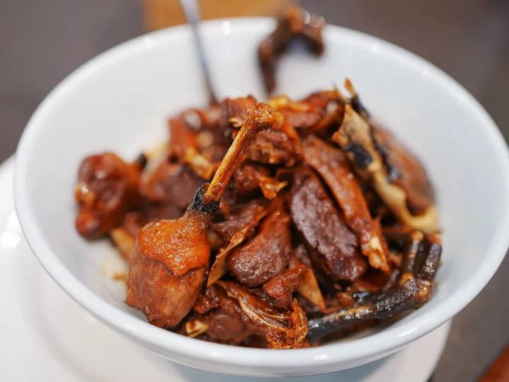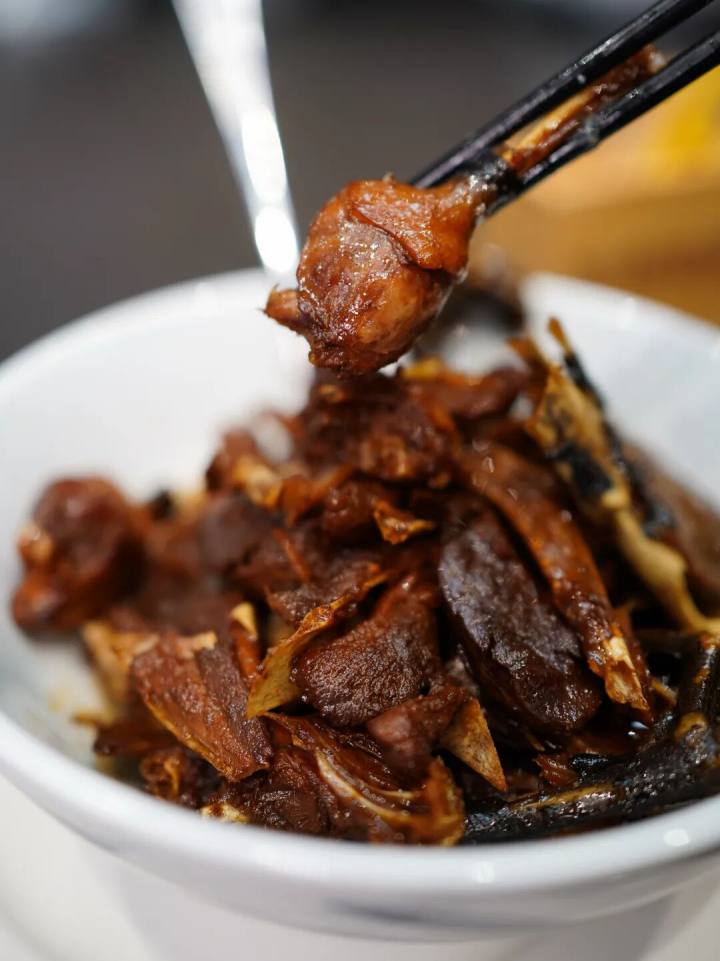 鸭子先用高压锅打一下,再起油锅生炒,稍微加一点姜片爆炒提香,炒至沉色若酱,食之皮脆肉嫩,迸焦酥香,咸鲜隽美。