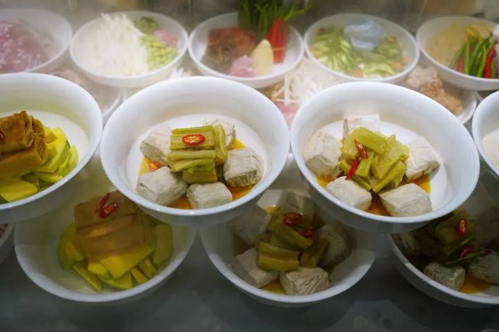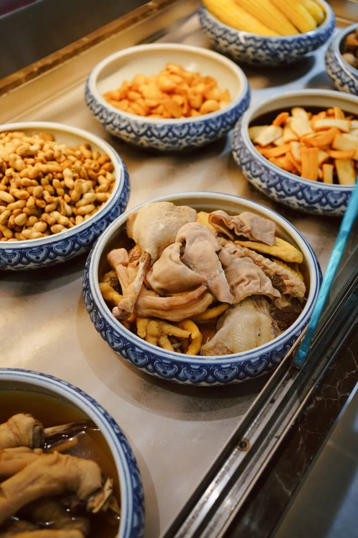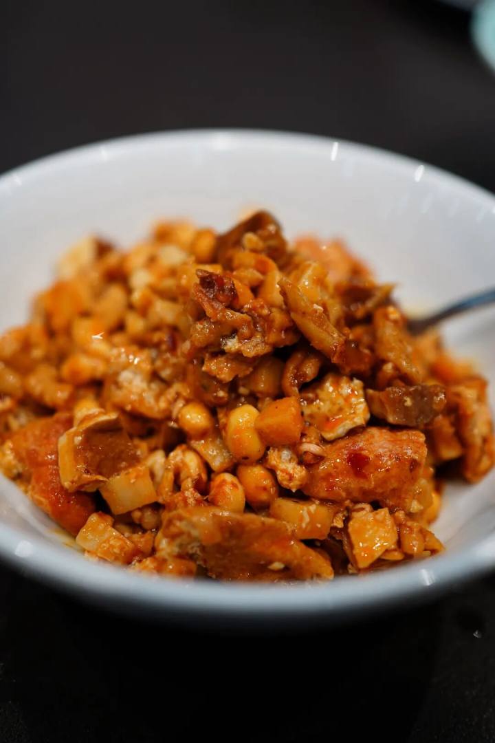 松林的酱丁容纳了笋丁、花生、肉丁、豆腐干、猪皮、黄豆、鸭肠、油豆腐诸物料,加油炒制,再小火慢炖,把猪皮的胶质全部炖出来,吃起来不似杭州八宝酱丁那般浓油赤酱,倒是平添一抹柔和,连花生米都显得柔软。